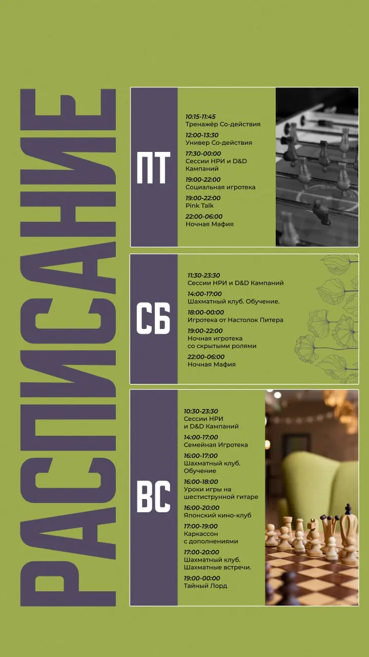 В течение недели проходят различные настольные игры, такие как карточные игры и экономические игры. Для любителей ролевых игр доступны сессии НРИ и D&D. Также есть городская и спортивная мафия. Проводятся занятия в шахматном клубе с обучением и встречи. Для изучающих языки — разговорные клубы английского и испанского. В выходные можно посетить Игротеку от Настолок Питера и поиграть в ночную мафию, а также в семейную игротеку. ✍
