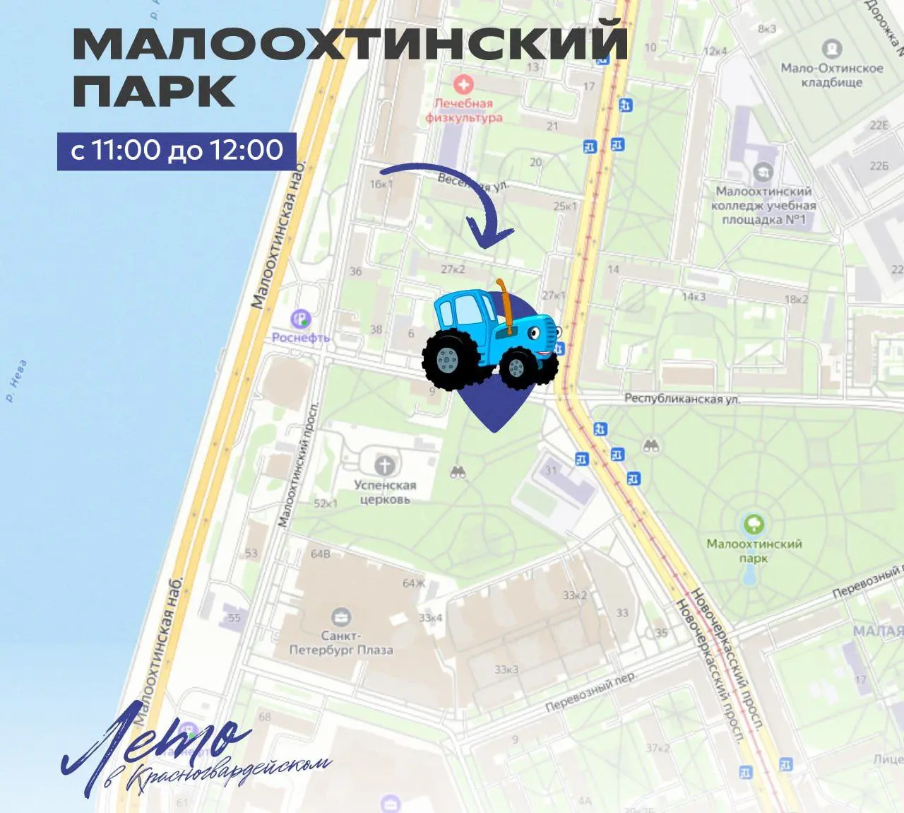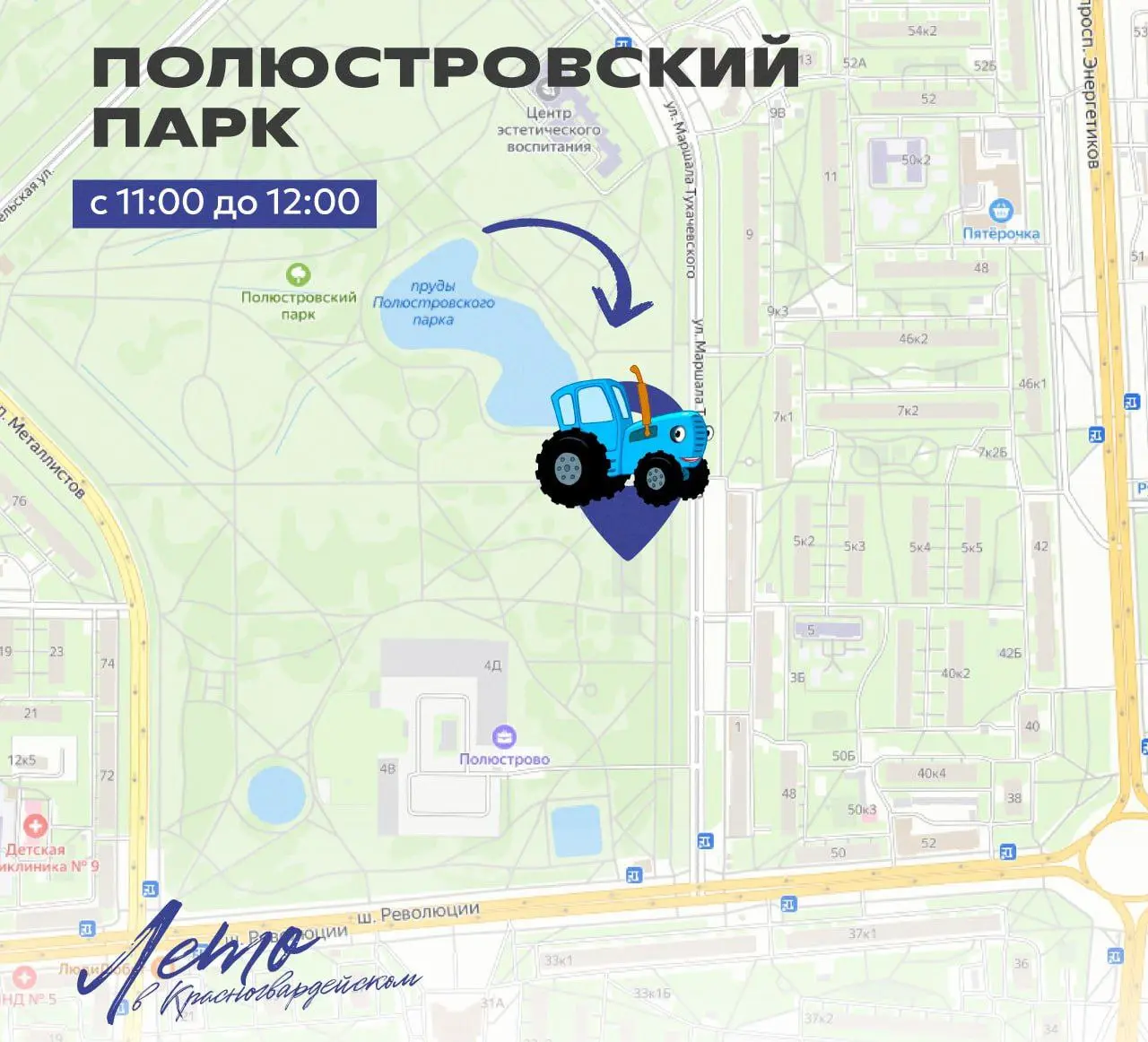 Это уже вторая фан-встреча с Синим Трактором в Красногвардейском районе. В мероприятии могут участвовать маленькие фанаты техники, они смогут познакомиться с героем, потрогать трактор, залезть в кабину и сделать красивые фото. Мероприятие организовано для детей и проходит в парке, сопровождается присутствием механика-специалиста, который отвечает на вопросы детей. Время проведения: по субботам с 11:00 до 12:00.