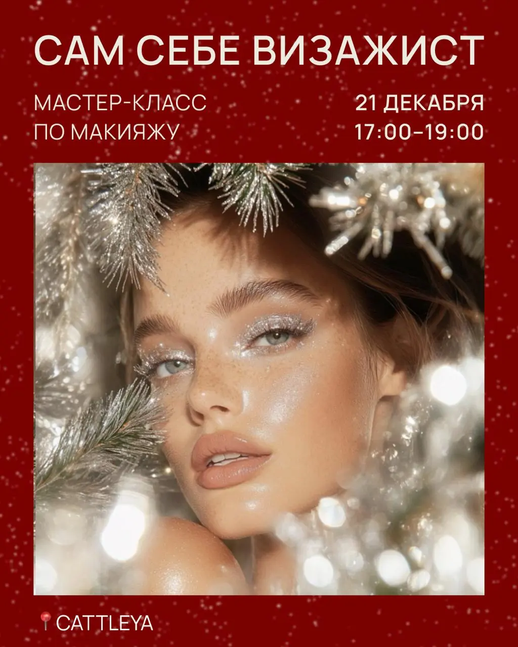 Создайте новогодние композиции из ели, включая венки и настольные украшения. Проведите мастер-класс по макияжу, изучая техники. Получите подарок от Cattleya. 💄