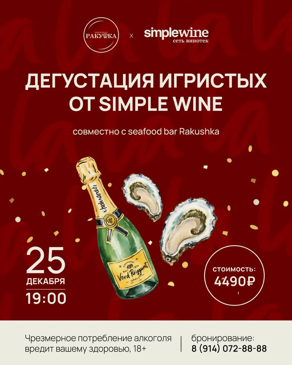 Попробуйте предновогодний ужин от сифудбара «Ракушка» и SimpleWine с дегустацией игристых вин и морепродуктов.🍷