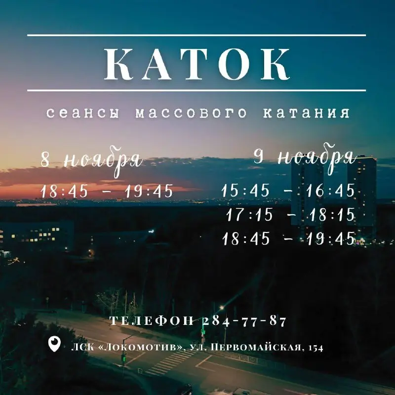 Приглашаем на массовое катание в ЛДС «Звёздный» (ул. Новосибирская, 17). Трёхсессионное мероприятие 9 ноября: 15:45–16:45 и 17:15–18:15. Стоимость: 100 рублей за час со своими коньками; 200 рублей за час проката коньков (плата за вход включена в стоимость проката). Допускается на лёд не более 150 посетителей за сеанс. Требуется залог за аренду коньков; принимаем паспортов не в залог, а в залог — ряд документов (студенческий билет, водительское удостоверение, пенсионное удостоверение, СНИЛС, свидетельство о рождении для детей до 14 лет, паспорт транспортного средства, свидетельство о регистрации ТС). Контакт: 284-16-35. Текст включает примечания и телефон.