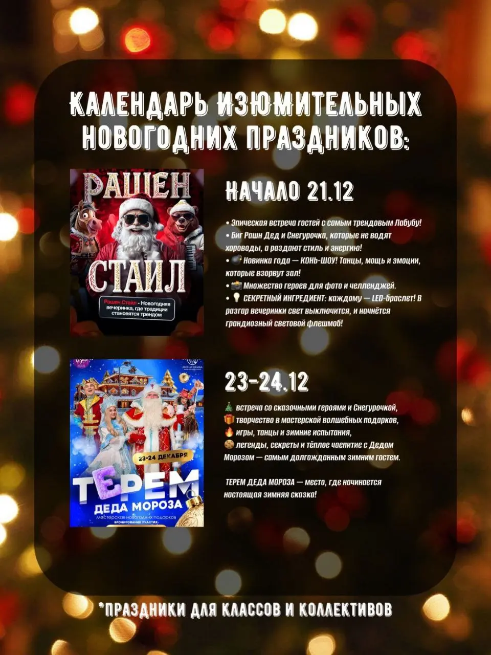 Мастерская праздников "Изюм" представляет новогодние мероприятия. В программе: встречи со сказочными героями, хороводы, танцы и световое шоу. Также новогодние программы для детей и корпоративов. Успейте забронировать место. ✨