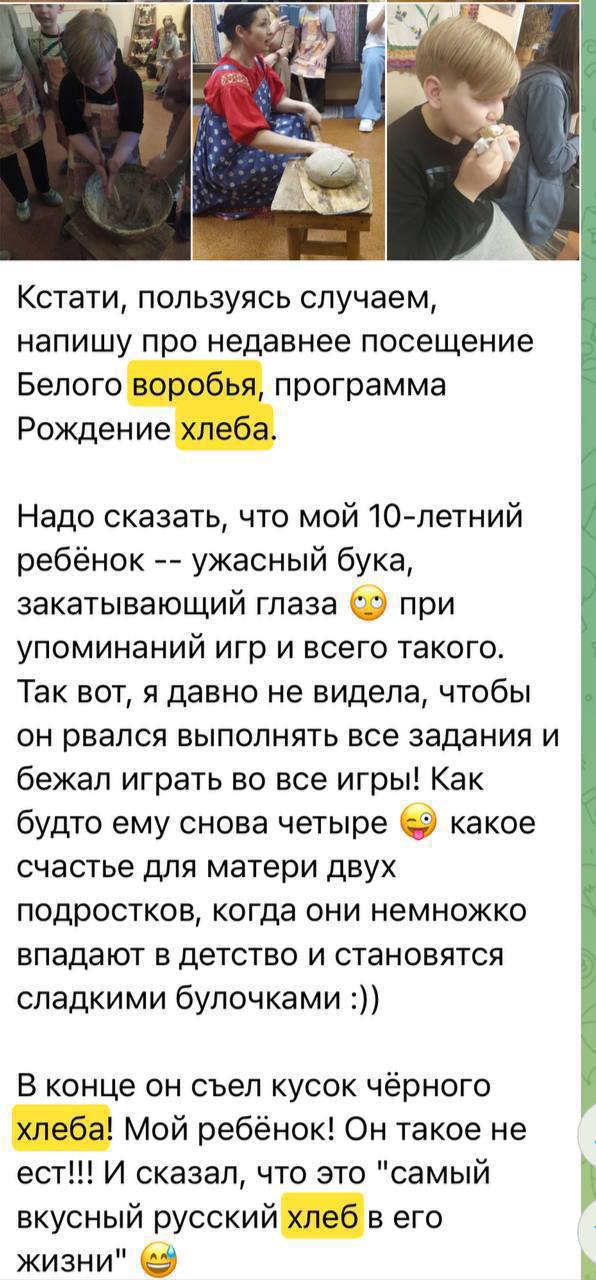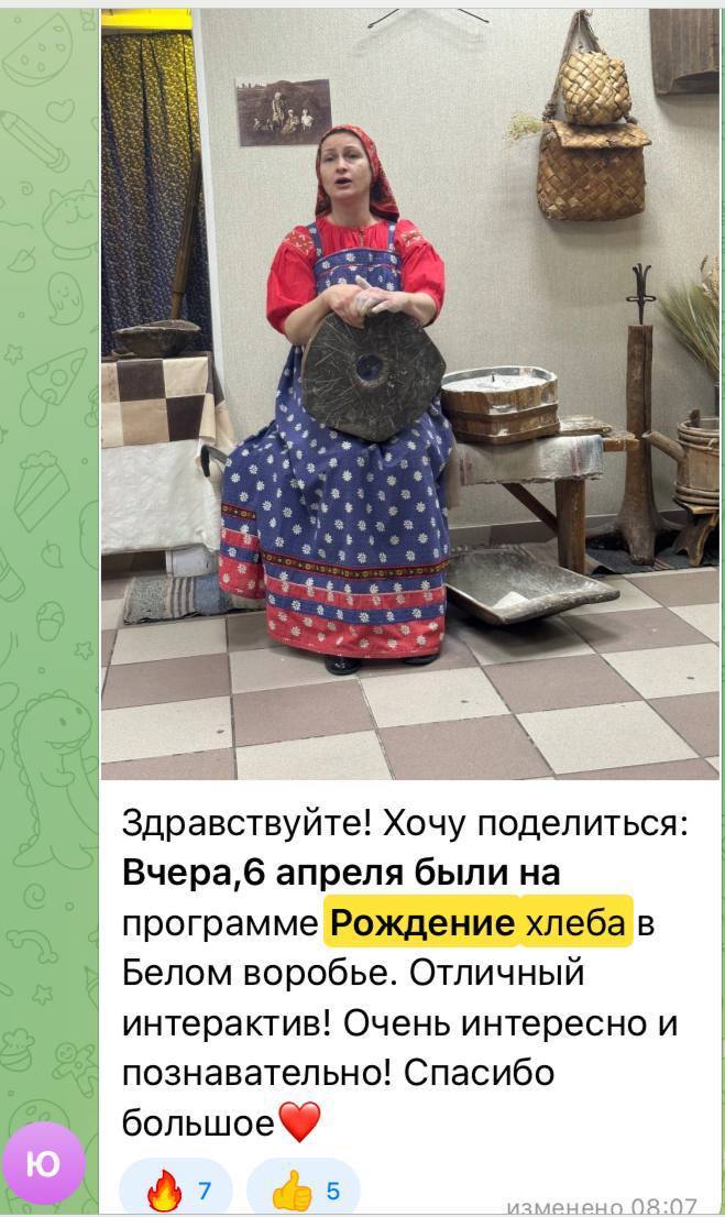 Ох и до чего душевная программа Рождение хлеба! Колоски мы посмотрели, зерна в ступе потолкли, на жерновцах помололи, через сито просеяли, мутовкой помешали, сделали хлебушек да отведали горячий с маслицем!