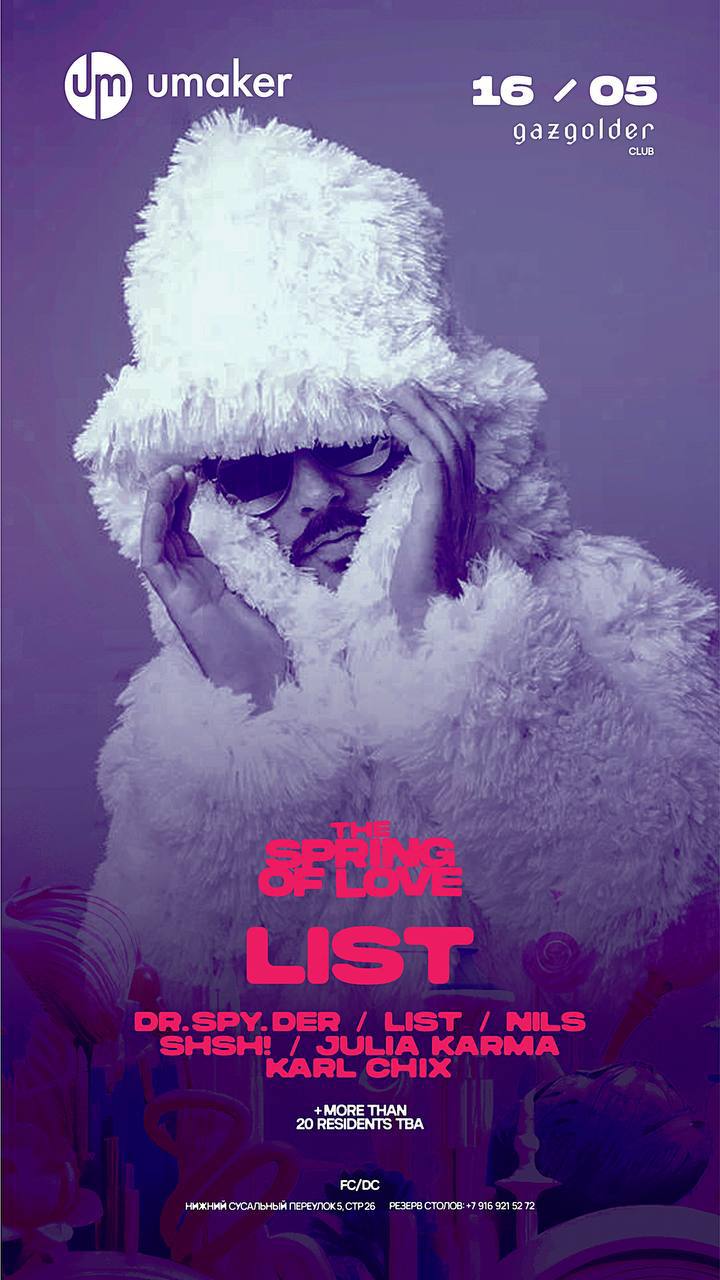 В эту пятницу в стенах Gazgolder Club пройдет вечеринка The Spring of Love с гостем из Франции LUKEA 🇫🇷. Лайн-ап включает легенд клуба Крыша Мира и других любимых московской аудитории артистов: DR.SPY.DER, LIST, NILS, KARL CHIX, JULIA KARMA, SHSH!, а также резидентов Umaker Community. Мероприятие начнется 16 мая в 22:00. Возраст 18+. Билеты доступны на umaker.ticketscloud.org. Место: Нижний Сусальный переулок, 5. Более 20 исполнителей ожидают участников в это событие.