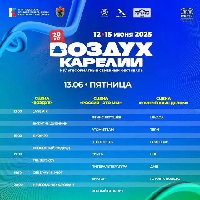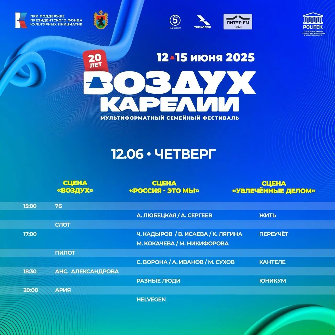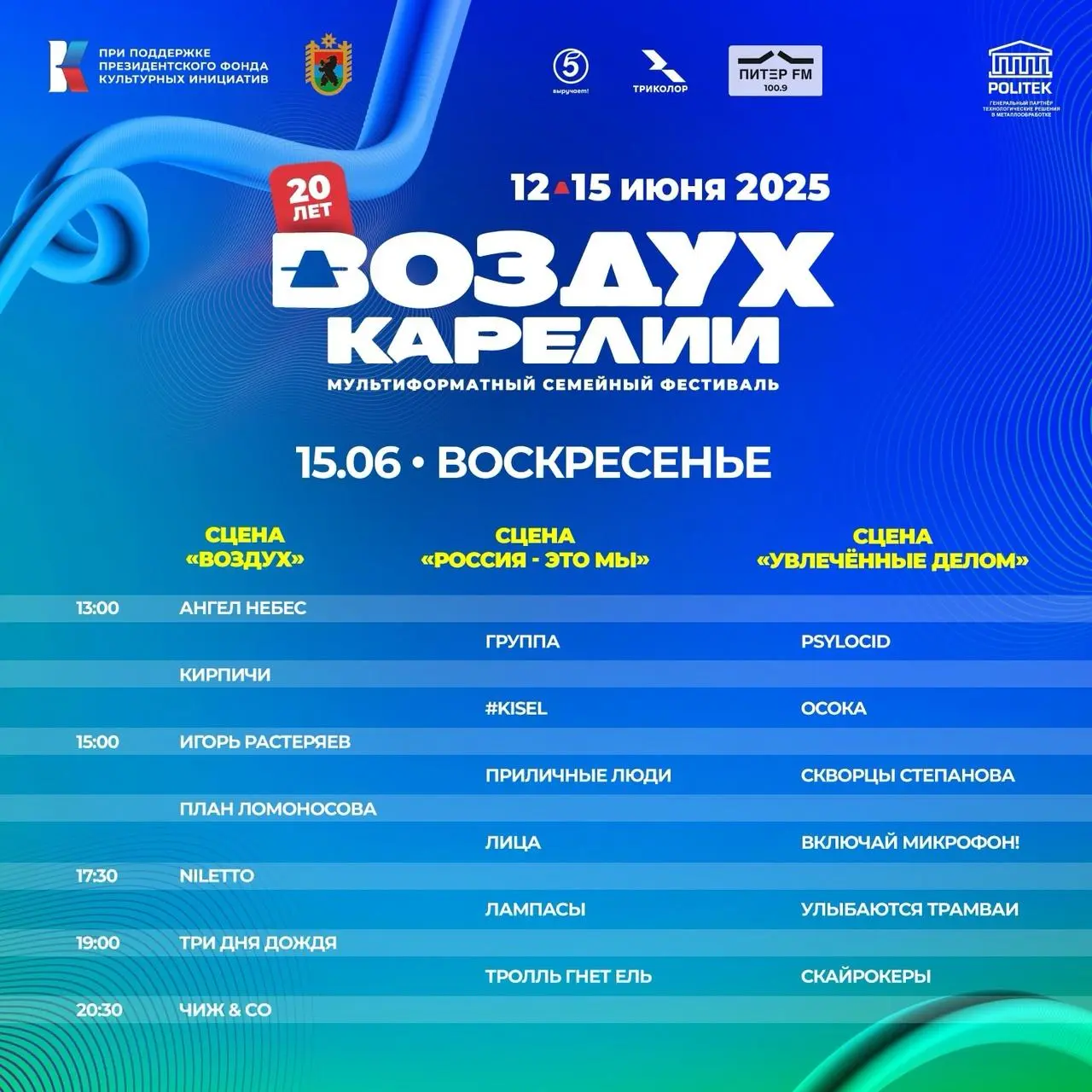 Завтра мы выезжаем в Петрозаводск, на Фестиваль "Воздух Карелии". Отвечаем на многочисленные вопросы по поводу расписания. Фестиваль начался уже сегодня днём. Мы играем в СБ 14-го июня в 16:50. До встречи! Таков Путь! Текст с прикрепленных фотографий: ПРИ ПОДДЕРЖКЕ ПРЕЗИДЕНТСКОГО ФОНДА КУЛЬТУРНЫХ ИНИЦИАТИВ ш PОLIТEK #ЕлЕ!льяптяны 9aтпаранл ПИТЕР FM 100.9 еввчаu ТРИКОЛОР 20 12- 15 июня 2025 ЛвТ 4O): z МАРжил МУЛЬТИФОРМАТНЫЙ СЕМЕЙНЫЙ ФЕСТИВАЛЬ 15.06 ВОСКРЕСЕНЬЕ СЦЕНА кВОВДУЬ СЦЕНА КРОССИЯ Этомыэ СЦЕНА КУВЛЕЧЁННЫЕ ДЕЛОМЖ 13.00 АНГЕЛ НЕБЕС ГРУППА PSYLOCID КИРПИЧИ #KISEL ОСОКА 15.00 ИГОРЬ РАСТЕРЯЕВ ПРИЛИЧНЫЕ ЛЮДИ СКВОРЦЫ СТЕПАНОВА ПЛАН ЛОМОНОСОВА ЛИЦА ВКЛЮЧАЙ МИКРОФОН! 1730 NlLEпO ЛАМПАСЫ УЛЫБАЮТСЯ ТРАМВАИ 1900 тРиДНЯ ДОЖДЯ ТРОЛЛЬ ГНЕГ ЕЛЬ СКАЙРОКЕРЫ 2030 ЧИЖ & сO