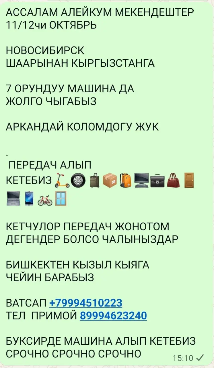 Мероприятие ориентировано на перемещение людей и передачу различных грузов и предметов между Новосибирском и Кыргызстаном, с акцентом на связи и контакты через WhatsApp и телефон.