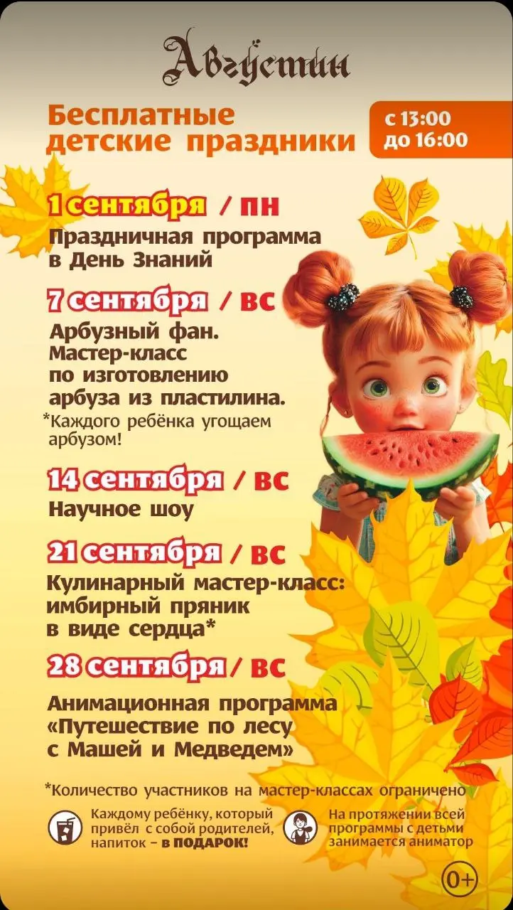 Полная информация о мероприятии: даты 25-30 августа 2025, место ЦРИ «Школа Плюс», Брянск, ул. Авиационная, 1А, ТЦ Айсберг, 3 этаж. В программе дни 26-27 августа — пробные занятия по подготовке к школе и тестирования по английскому языку; 28 августа — детский праздник; 30 августа — закрытие расписания; 31 августа — подведение итогов лотереи. Курсы с 1 сентября: подготовка к школе, английский, школа изобретателей, математический театр, быстрочтение, красивый почерк, беби-клуб, логопед. Участие бесплатное, требуется запись. Контакты: +7 900 366-3030, vk.cc/cpSVSg.