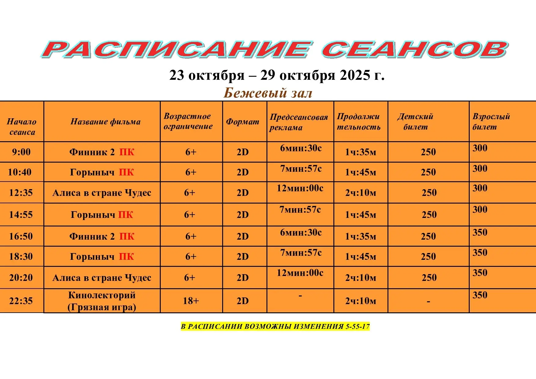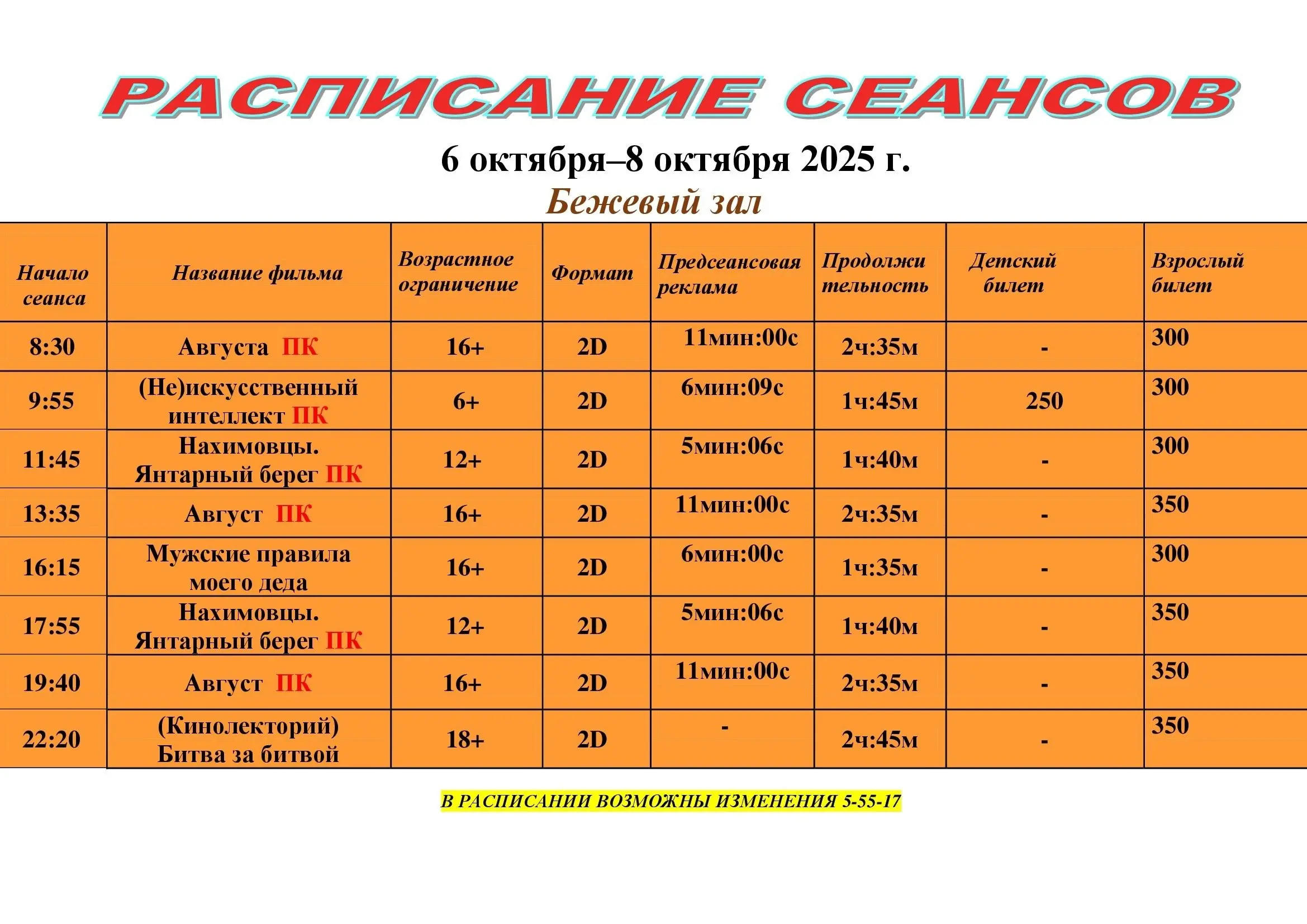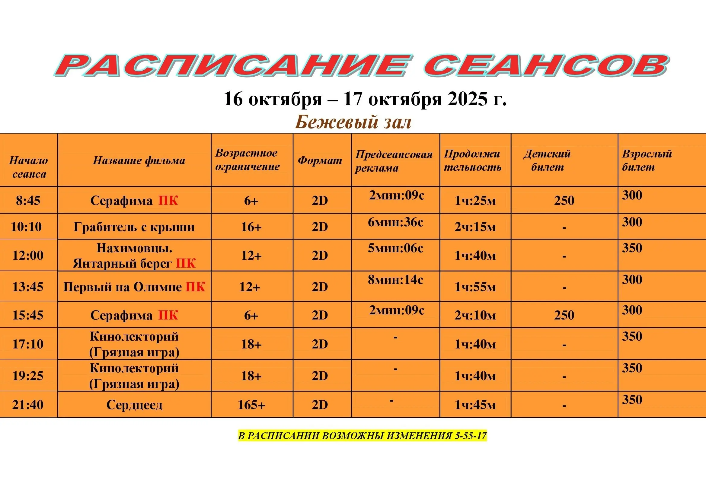 Расписание сеансов 16 октября по 17 октября 2025 г.
