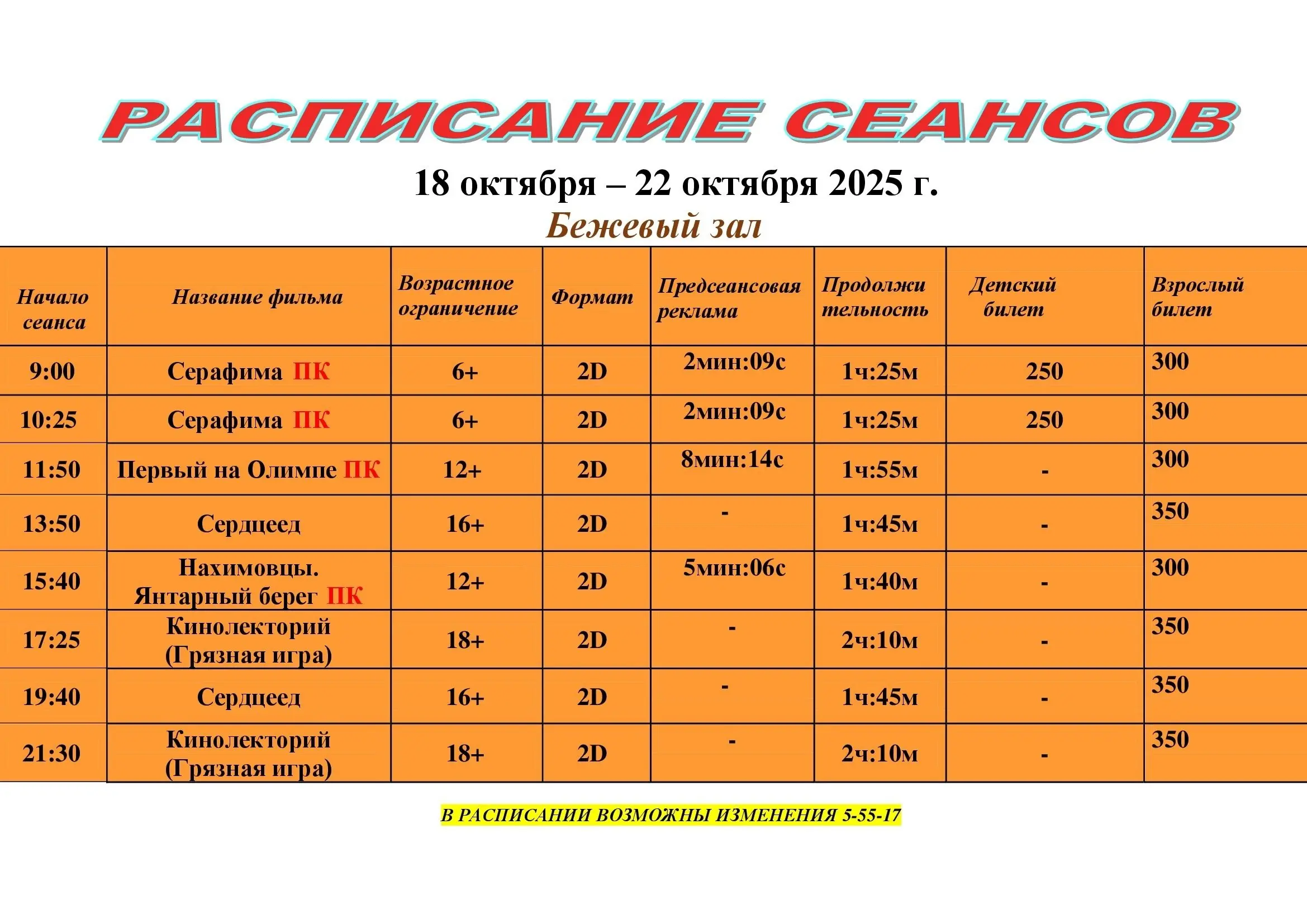 Расписание киносеансов 18 октября — 22 октября 2025 года