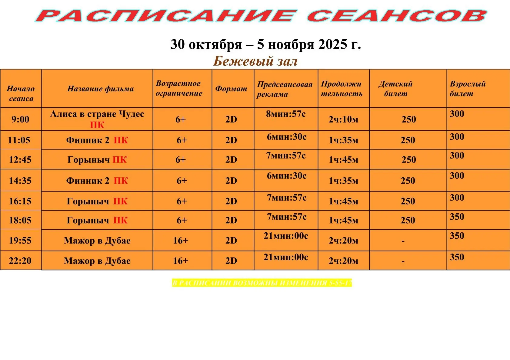 Расписание кинотеатра: period 30 октября - 5 ноября 2025