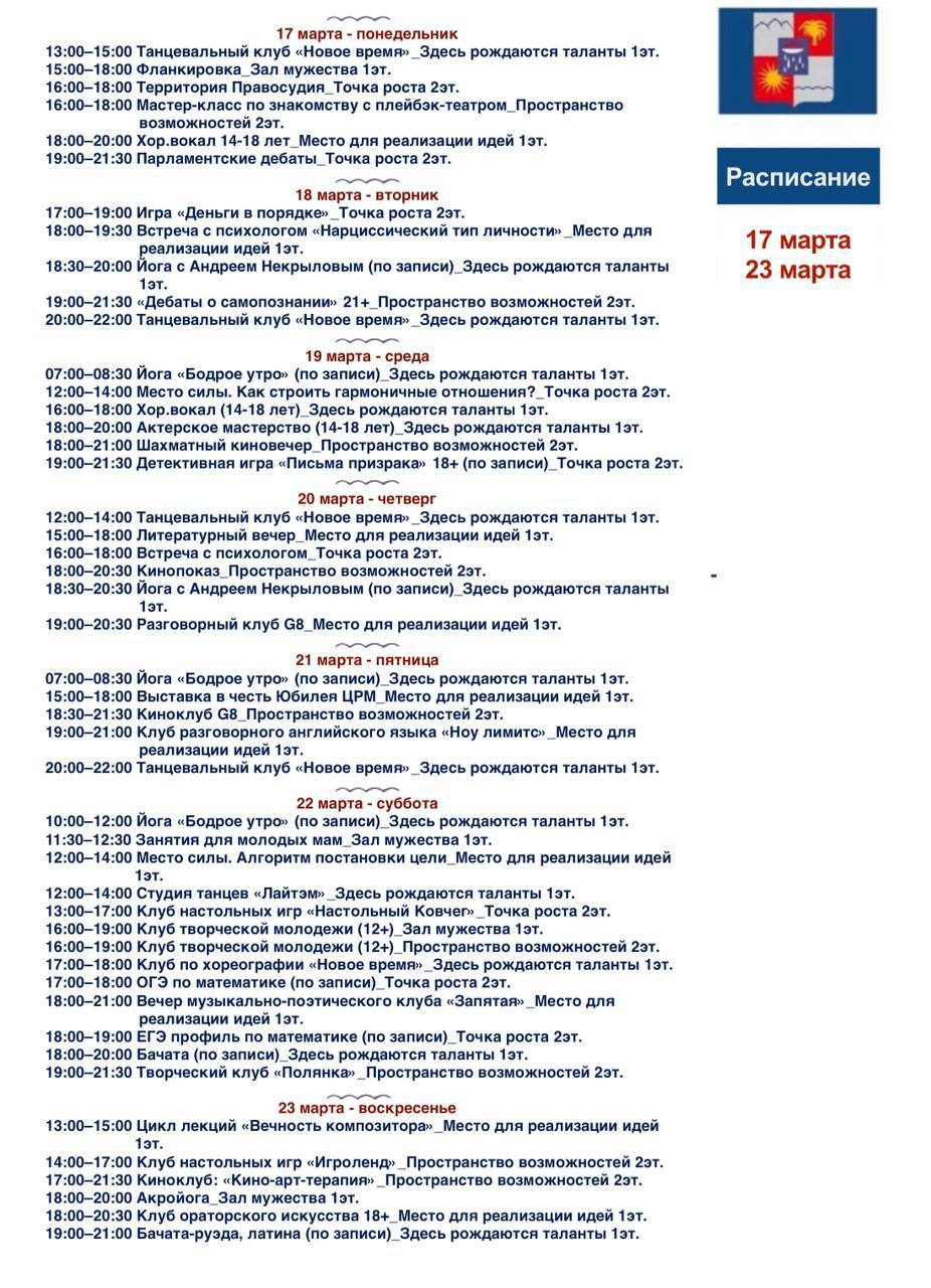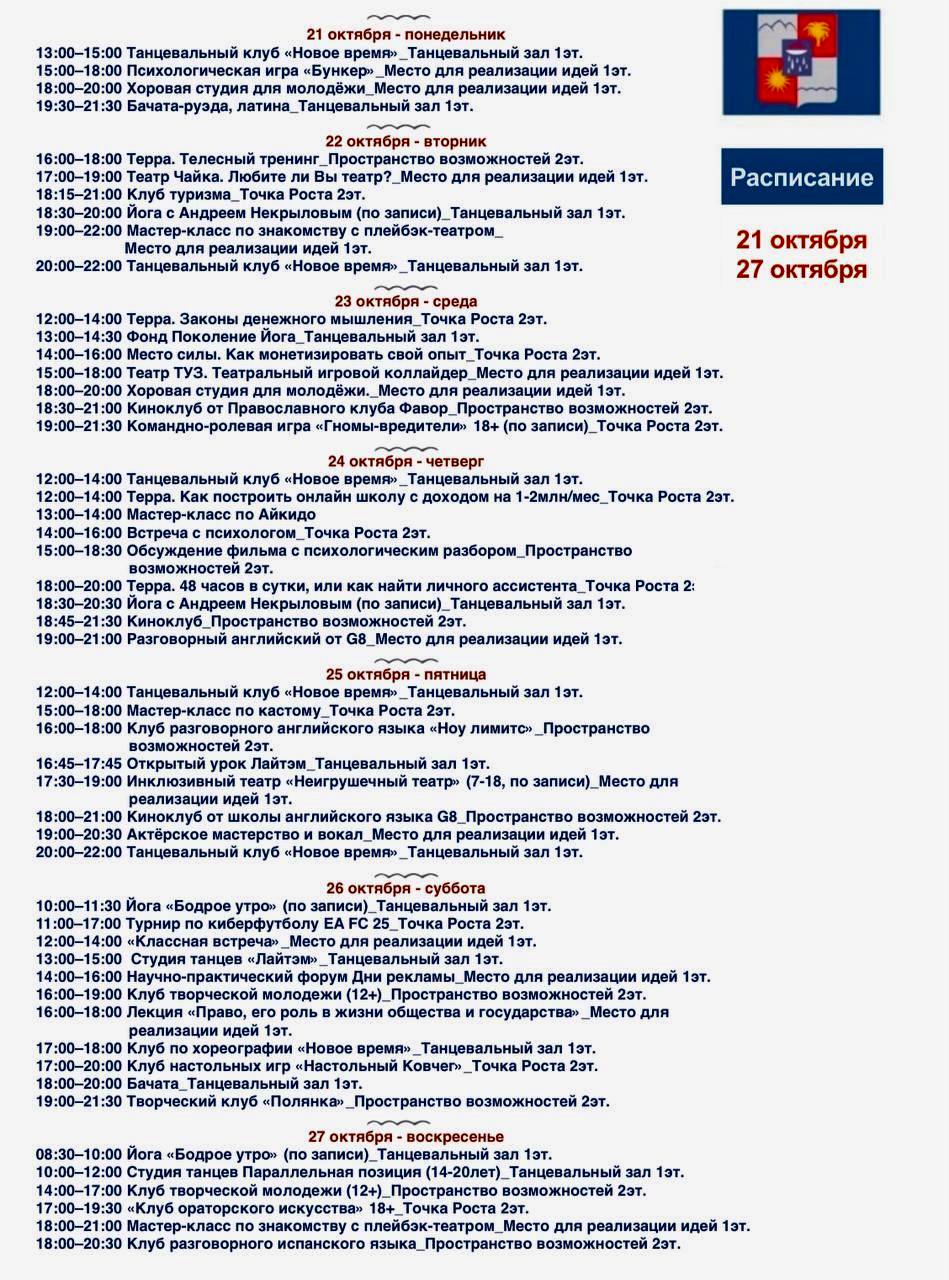 Расписание мероприятий в Доме Молодёжи с 21 по 27 октября