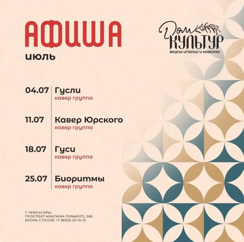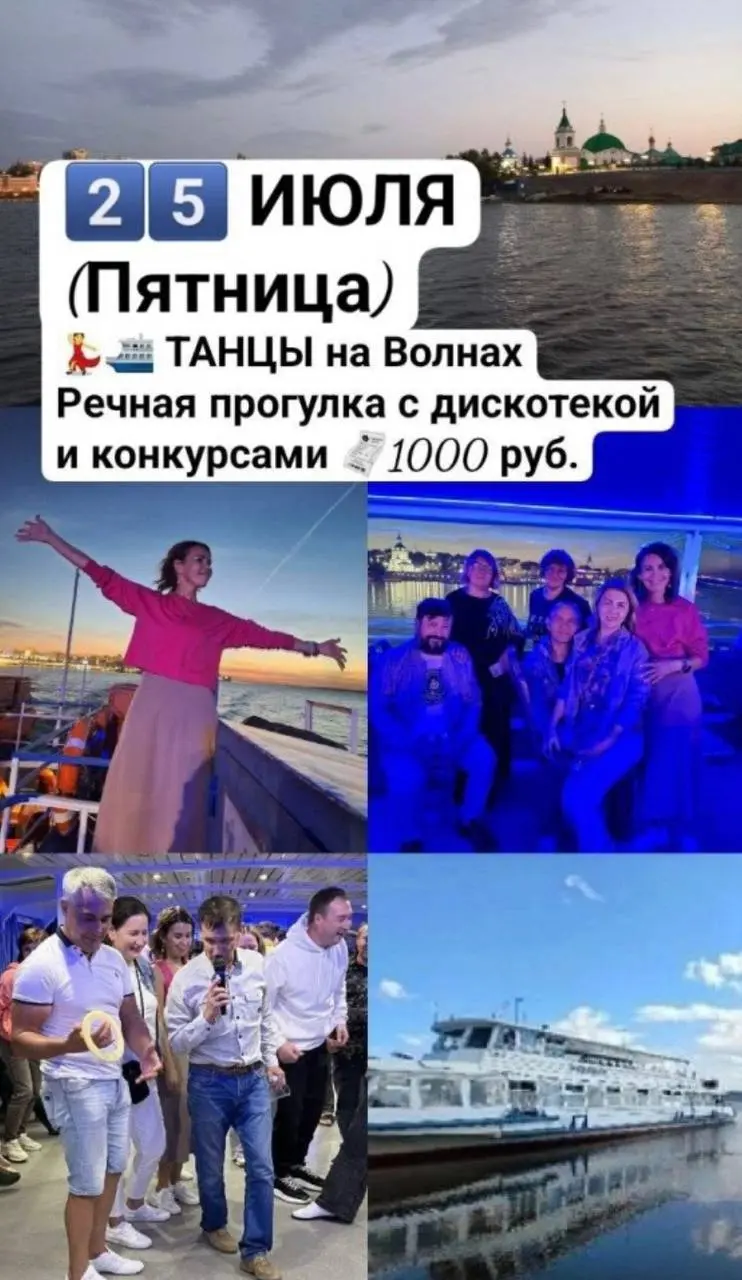 Мероприятие включает несколько событий: 23 июля в театре оперы и балета - монологи о любви; 25 июля на двухпалубном теплоходе - прогулка на волнах; 25 июля в ресторане - выступление кавер-группы "Биоритмы". Также есть информация о кавер-группах, выступающих в течение июля на других датах, и контактные данные для бронирования и заявки.