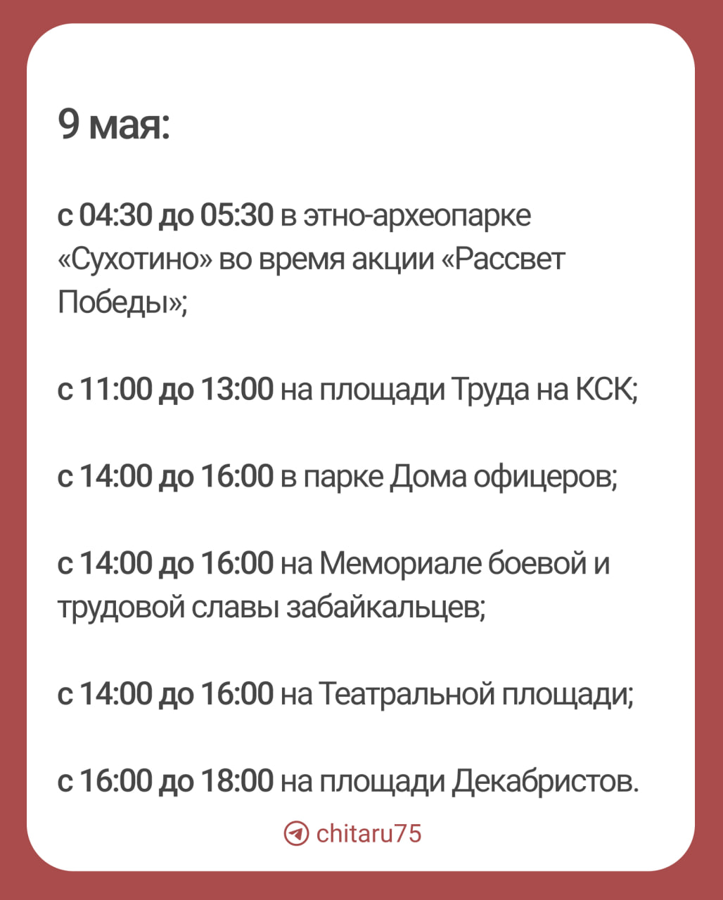 Сегодня с 14:00 до 15:30 на Мемориале боевой и трудовой славы пройдет встреча под названием "Греча, вот это встреча!". В рамках мероприятия будет организована реконструкция боев времен Великой Отечественной войны, фронтового госпиталя и партизанского быта. Также в эти даты и на указанных площадках будут работать полевые кухни с кухней из гречневой каши с тушенкой и хлебом с салом. 10 мая полевая кухня будет работать на площади Ленина с 18:00 до 19:30, 11 мая — на Театральной площади с 15:00 до 16:30.