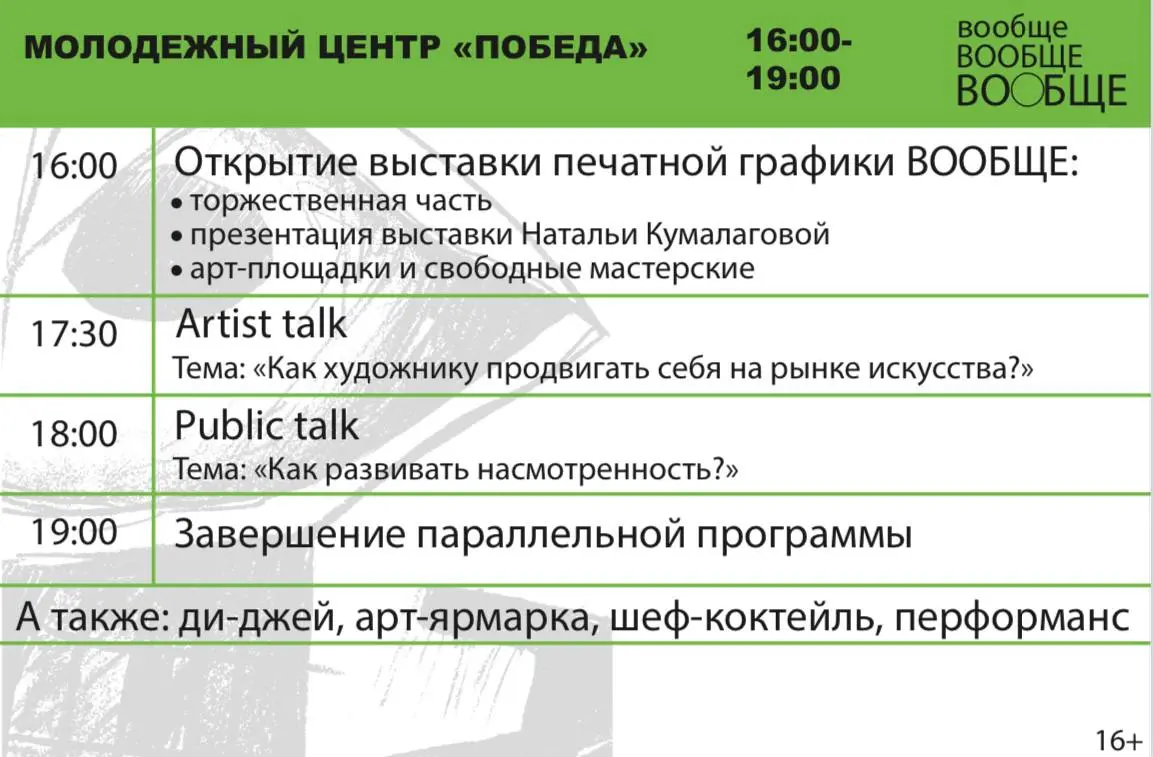 С 16:00 в молодёжном центре «Победа» - откроется выставка печатной графики Натальи Кумалаговой. Гости станут активными участниками программы: можно будет пообщаться с художниками, коллекционерами, кураторами!