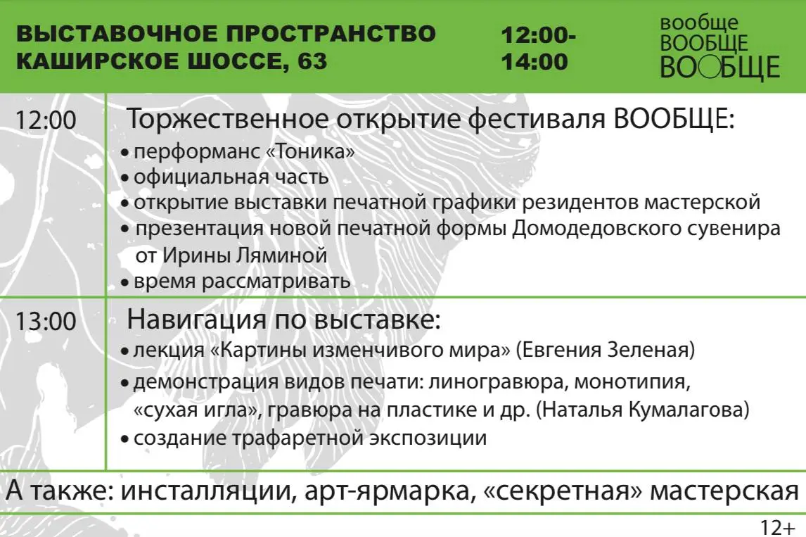 С 12:00 откроется выставка в галерейном пространстве Каширское шоссе, 63 (кафе «Шоколад»). Что это за выставка? - будут представлены работы резидентов мастерской печатной графики. Можно узнать и попробовать различные техники печати, узнать историю печатных досок и, конечно, интересная параллельная программа!