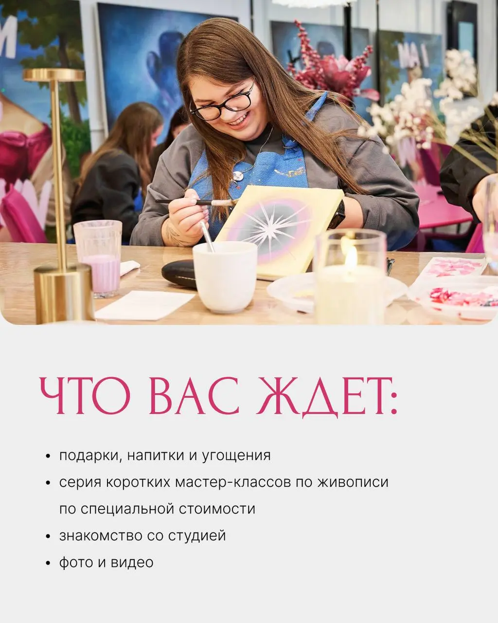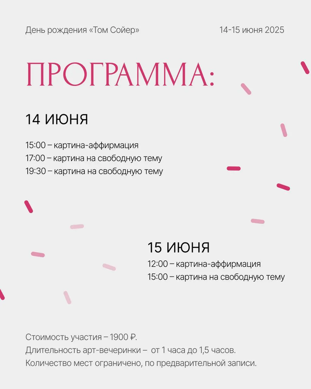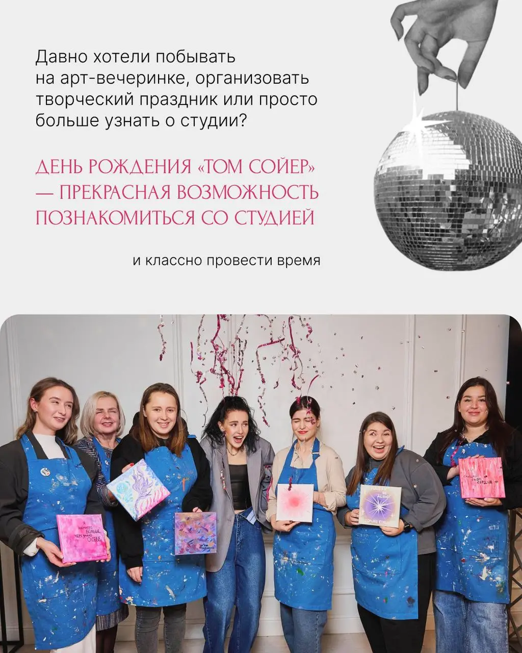 Мы подготовили мастер-классы по живописи длительностью до 1,5 часов, на которых будем рисовать популярные сюжеты и картины-аффирмации. Это не только возможность классно провести время, но и познакомиться с нашей студией поближе. Приглашаем всех, кто давно хотел у нас побывать и всех друзей! Расписание вечеринок на 14 и 15 июня – в карточках. Стоимость: 1900 рублей. Адрес: ул. Луначарского, 139, оф. 505. Запись: @tom_soyer_chat.