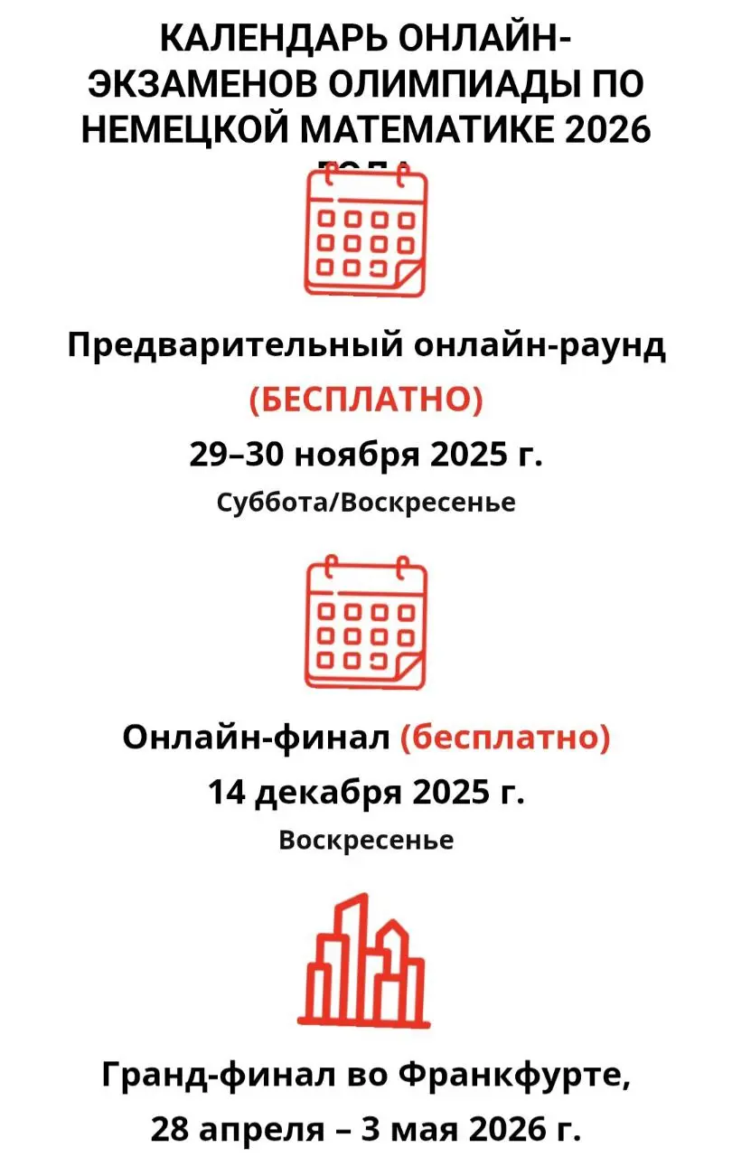 Проходят две олимпиады: MathCat и немецкая олимпиада. Участие в онлайн-раунде бесплатное. Онлайн-финал состоится 14 декабря 2025 года. Гранд-финал пройдет во Франкфурте с 28 апреля по 3 мая 2026 года. 🗓