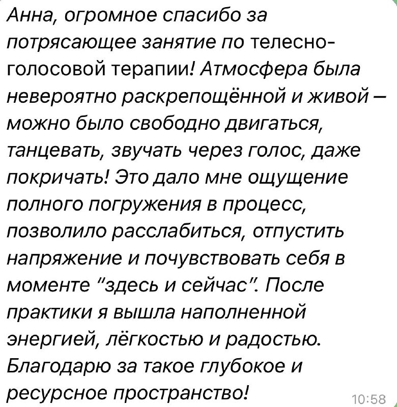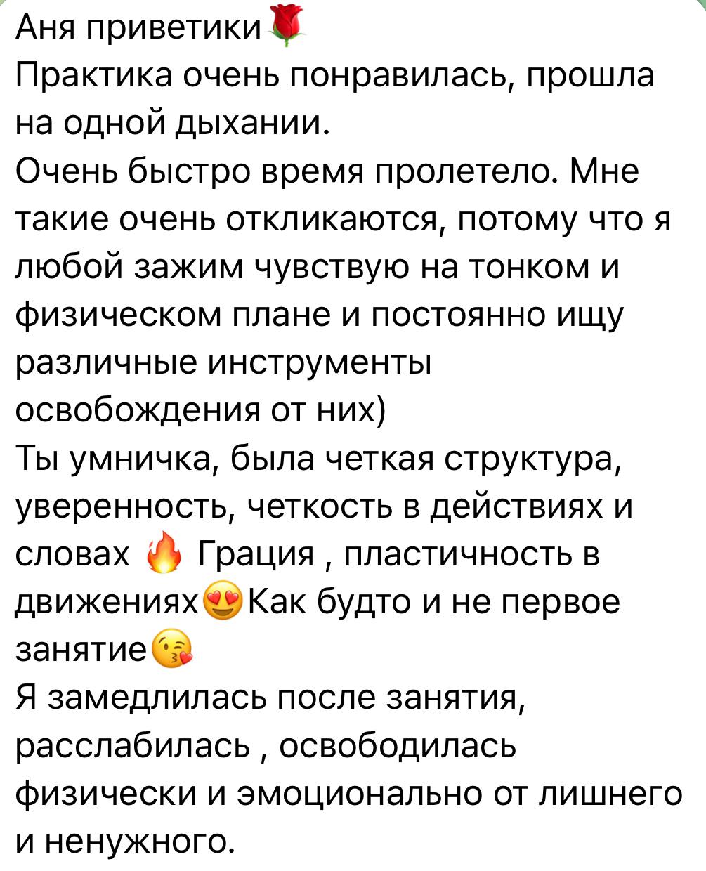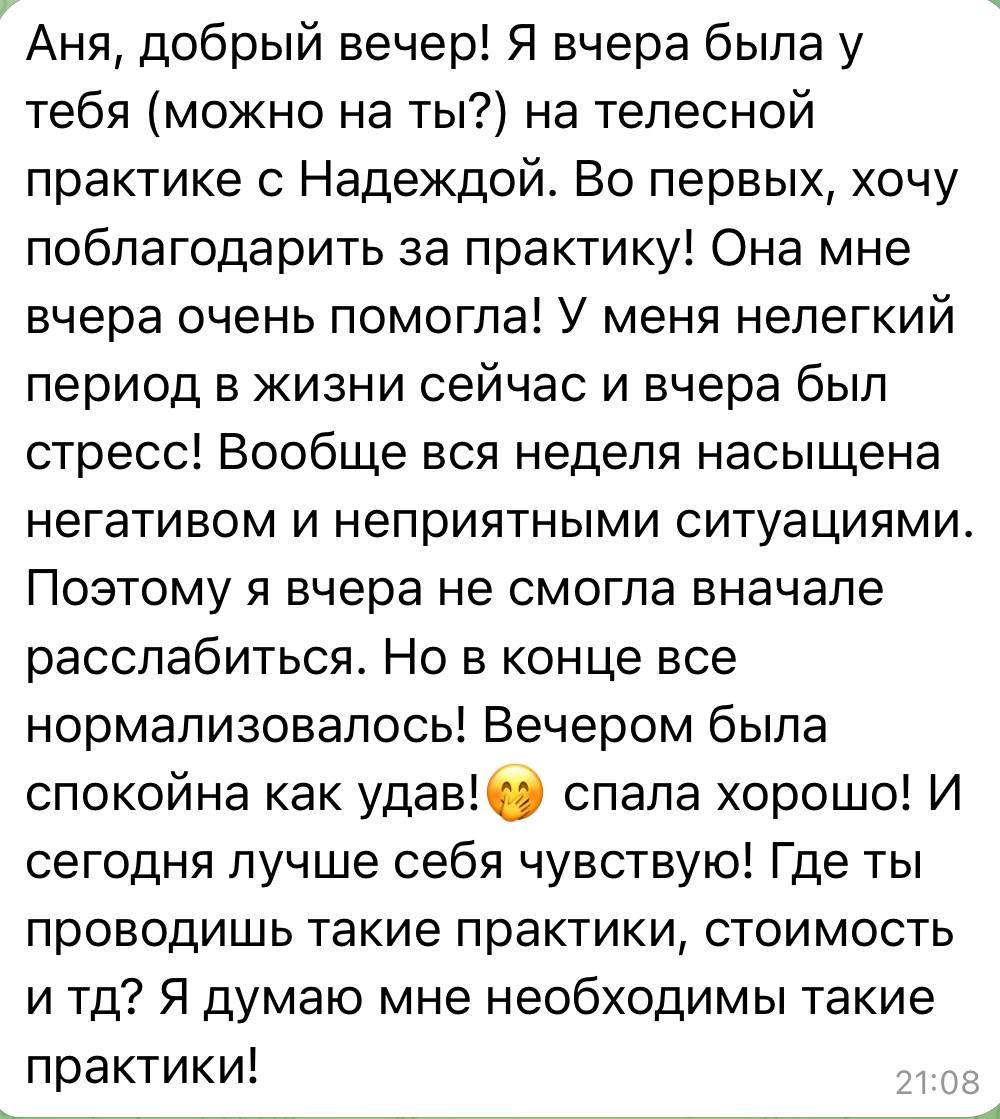 Аня; привет: Хочу тебя поблагодарить за телесную практику, что ты провела! Для меня работа с телом ЭТО непросто, нO с тобой у меня легко получилось расслабиться и отдаться процессу Очень бережно и грамотно построена программа от дыхательной практики, до активной части и идеальное завершение медитацией. Мне очень понравилось: После я чувствовала потрясающее расслабление, спокойствие и гармонию внутри: От души благодарю и обязательно буду рекомендовать тебя подружкам и знакомым:. Я считаю; что такая практика будет полезна всем! 21.29