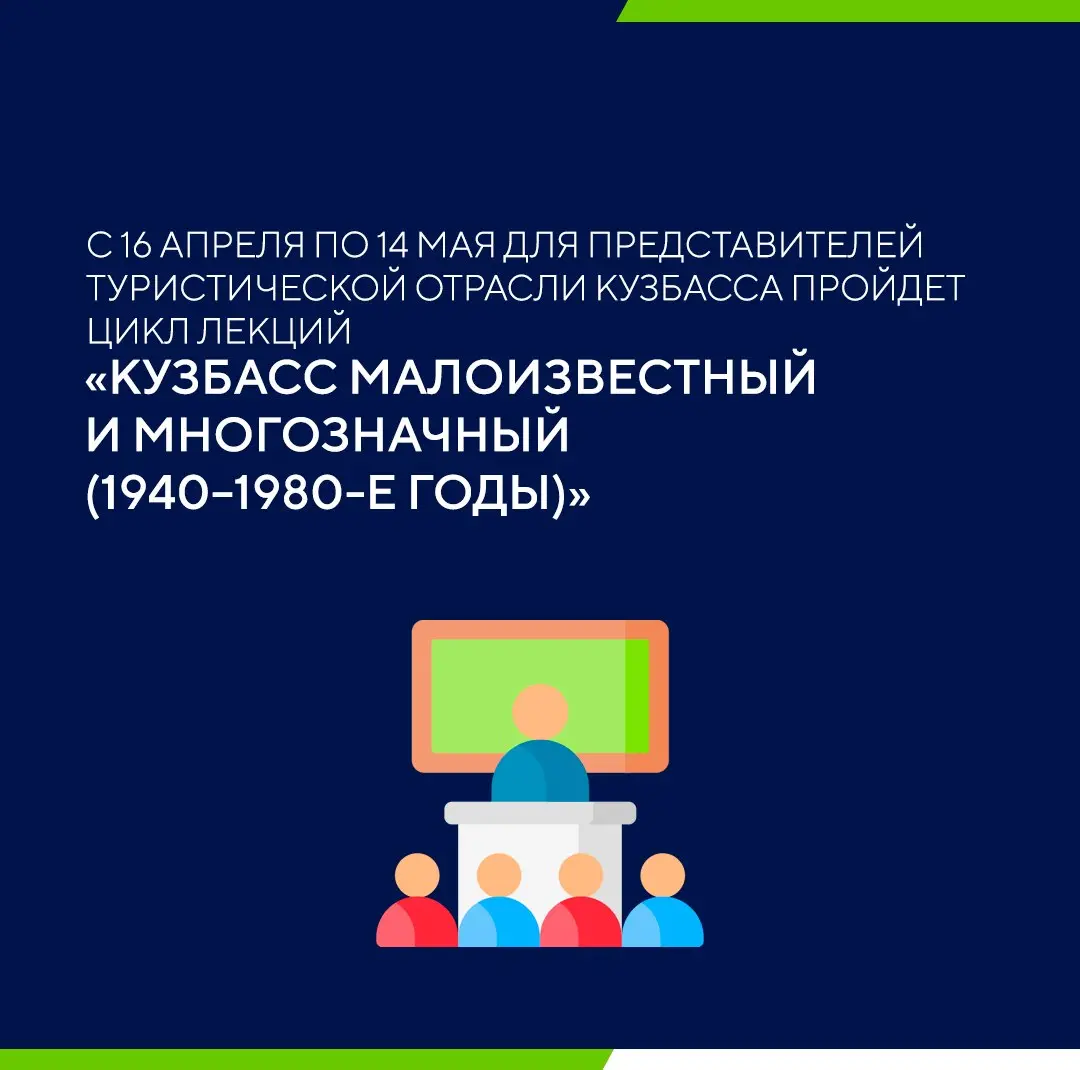 С 16 апреля по 14 мая пройдет цикл лекций "Кузбасс малоизвестный: ХХ век". Событие адресовано работникам туристической сферы Кузбасса. Лекции охватывают период с 1940-х по 1980-е годы. Участники узнают о малоизвестных страницах истории региона.