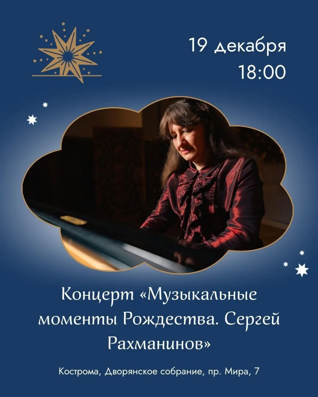 Фестиваль «Звезда Рождества» приглашает на концерт. Вас ждут «Музыкальные моменты Рождества» Сергея Рахманинова. Место проведения: Кострома, Дворянское собрание. Ждем вас! 19 декабря в 18:00.