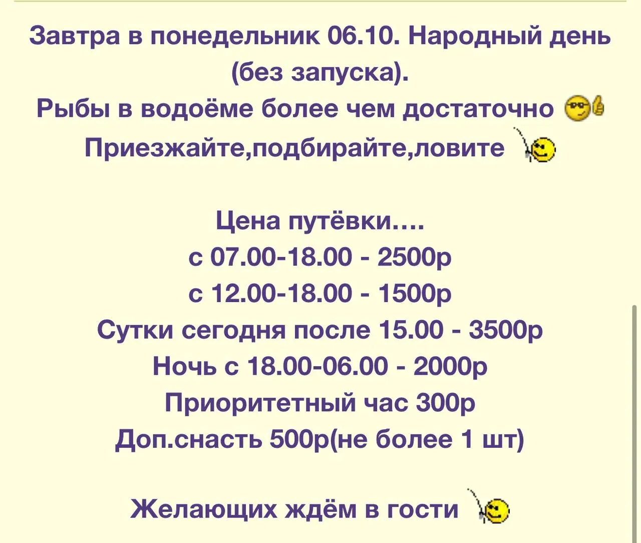 Уважаемые рыбаки: в субботу 4 октября будет проходить корпоратив завода. Для них выделены две зоны: весь новый понтон и от настила по берегу администрации до старого понтона; для остальных рыбаков — под серым мостом весь настил, вся дамба и старый понтон. Там где выделенное будет корпоратив. Основной водоем 2j Os. Спорт зона.