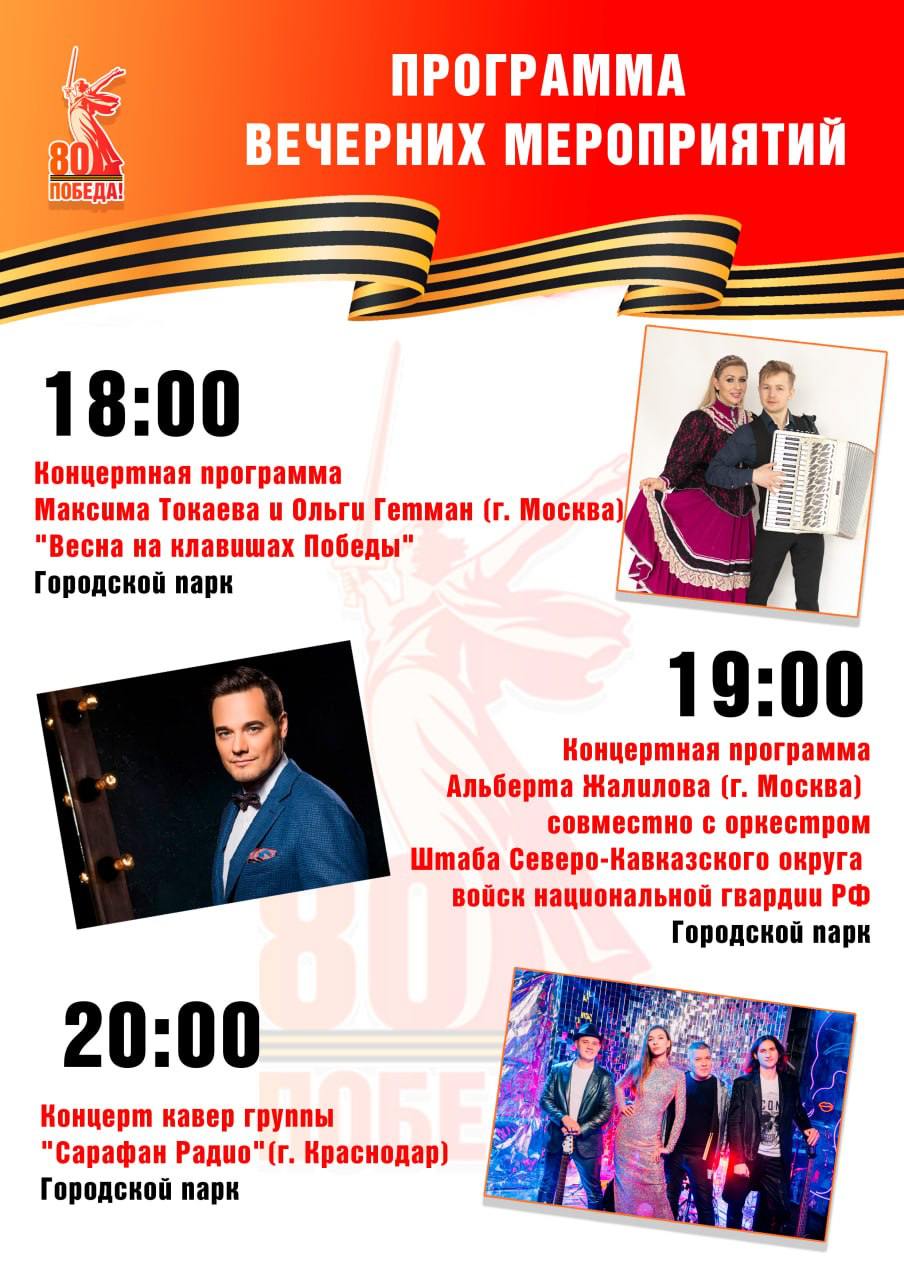 8 мая на площади Победы состоится акция «Память поколений», включающая факельное шествие и театрализованную программу «Можно убить меня, нас убить невозможно!». Начало программы в 20.00. 9 мая в 11.00 — торжественное мероприятие «В память о павших, во славу живых». С 12.00 в городском парке запланирована праздничная программа с участием творческих коллективов, интерактивные мероприятия, мастер-классы, выставка изделий. Вечер откроется выступлениями артистов, в том числе Ольги Гетман, Максима Токаева, Альберта Жалилова, завершится выступлением кавер-группы «Сарафан радио». Мероприятия проходят в г. Лермонтов.