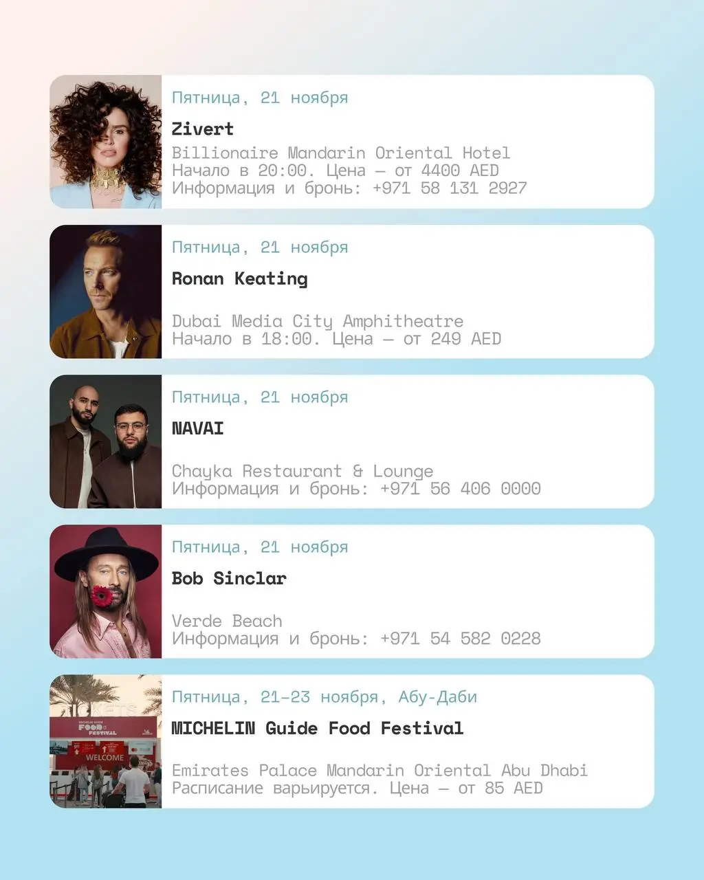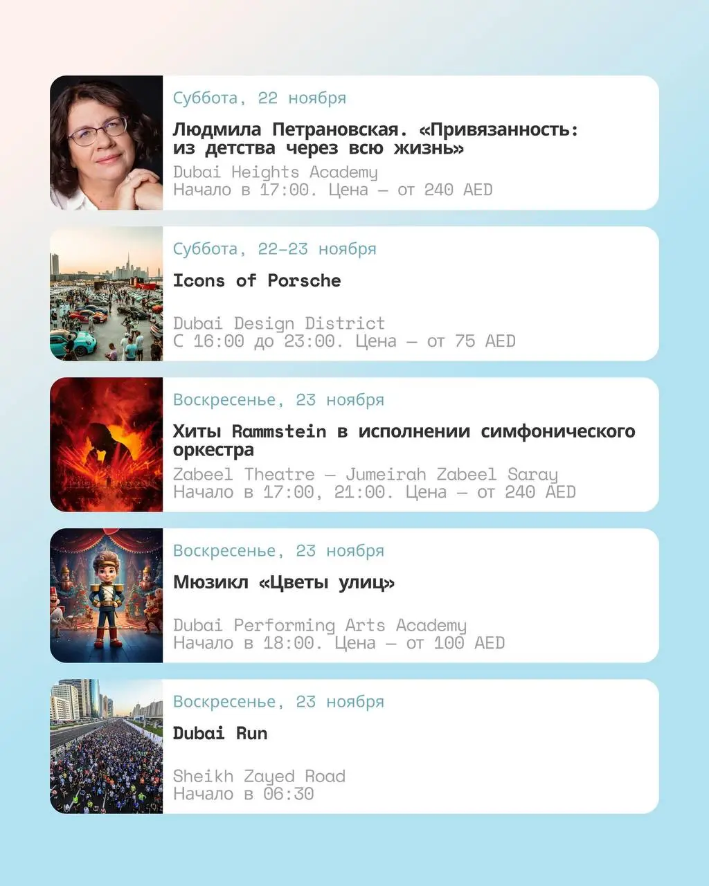В выходные запланированы мероприятия: фестиваль Icons of Porsche, забег Dubai Run, концерты исполнителей Zivert, NAVAI, Ольги Серябкиной и танцы под музыку Bob Sinclar. В прикрепленных фото указаны конкретные события: презентации и мероприятия в Dubai Design District, симфонический концерт Rammstein в исполнении оркестра, мюзикл «Цветы улиц» в Dubai Performing Arts Academy, Dubai Run на Sheikh Zayed Road. Указаны даты, время начала и ориентировочная стоимость билетов.