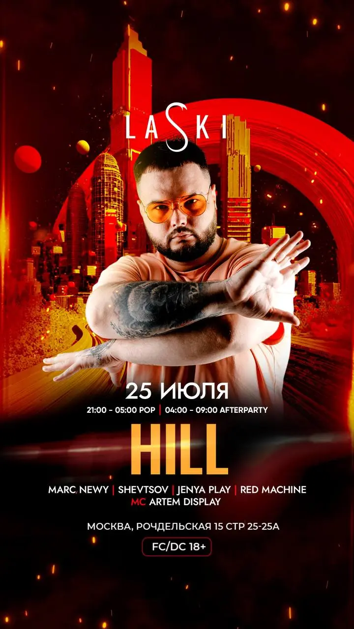 DJ HILL — мультиформатный dj, резидент популярных московских клубов, двукратный победитель «LIGADEEJAY». Сеты DJ Hill — это всегда мощная энергетика, самые свежие треки, неожиданные музыкальные переходы и яркость танцпола до рассвета. Встреться с лучшими моментами лета — вместе с LASKI и DJ HILL!
