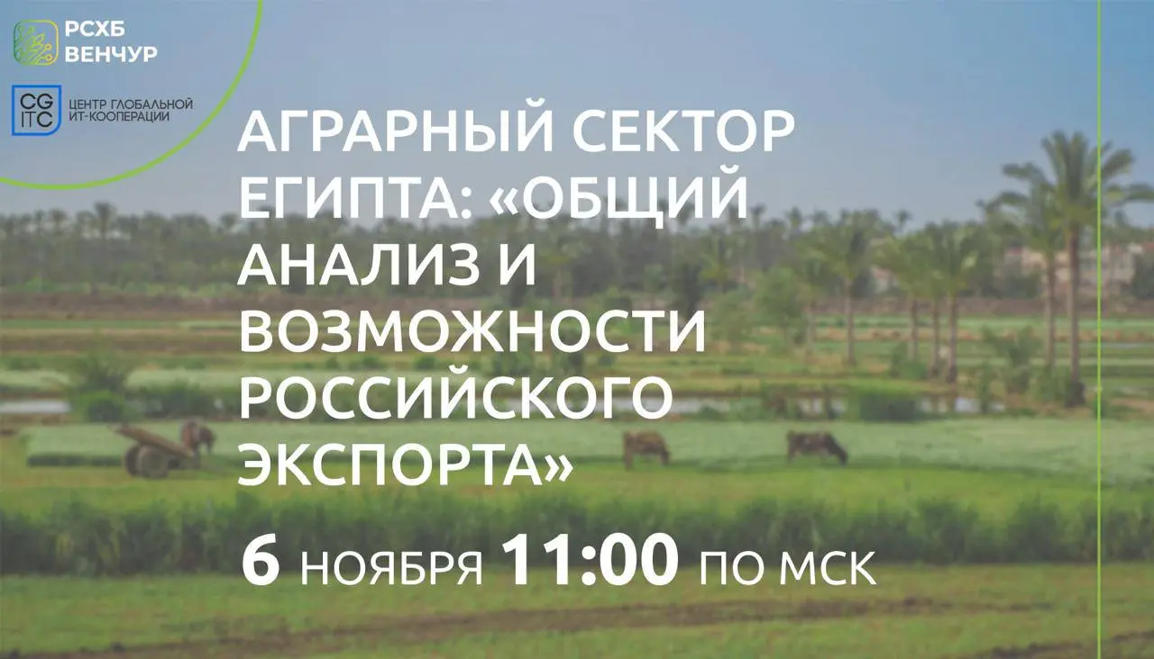 Презентация аналитического исследования «Аграрный сектор Египта: общий анализ и возможности российского экспорта» с участием Россельхозбанка и Центра глобальной ИТ-кооперации. Мероприятие включает обсуждение драйверов роста аграрной экономики Египта, структуры сельского хозяйства, инфраструктурных вызовов, цифровизации и агротех, барьеров и возможностей экспорта, инструментов поддержки экспортеров и перспективных направлений (цифровые платформы для фермеров, ирригационные решения, сельхозмашиностроение, генетика и селекция). Время: 6 ноября, 11:00–14:00. Место: Корпоративный университет Россельхозбанка, Москва. Регистрация до 4 ноября.