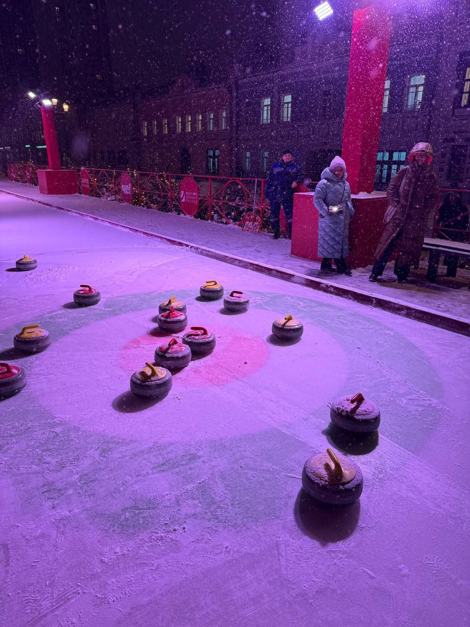 На пешеходной улице Школьной в районе Таганки расположились две дорожки для игры в кёрлинг. С утрa до вечера опытные инструкторы рассказывают и показывают, как правильно пулять камни