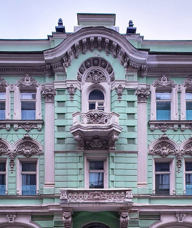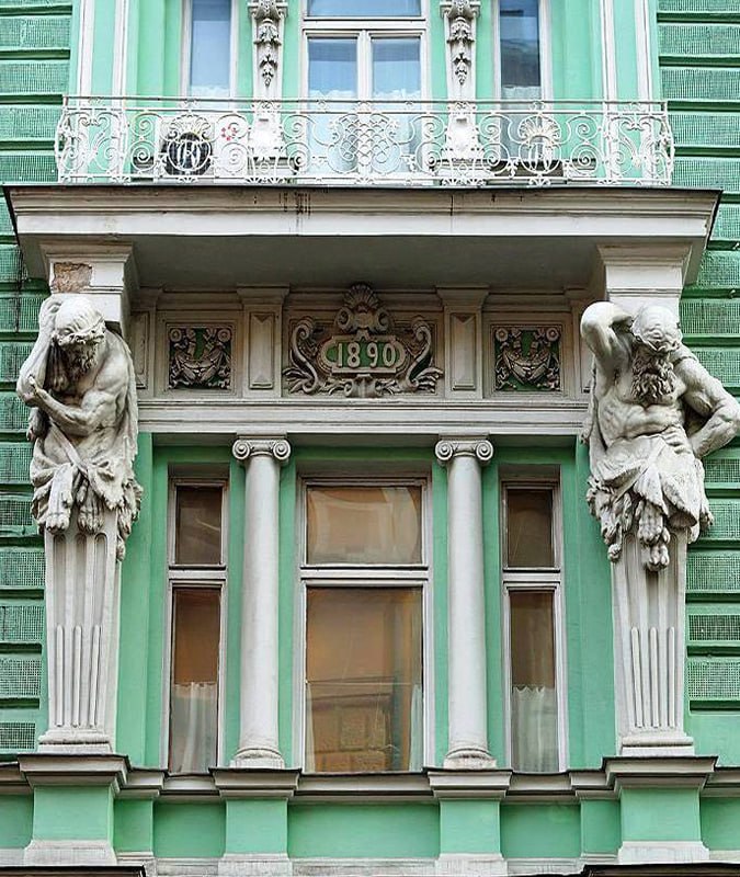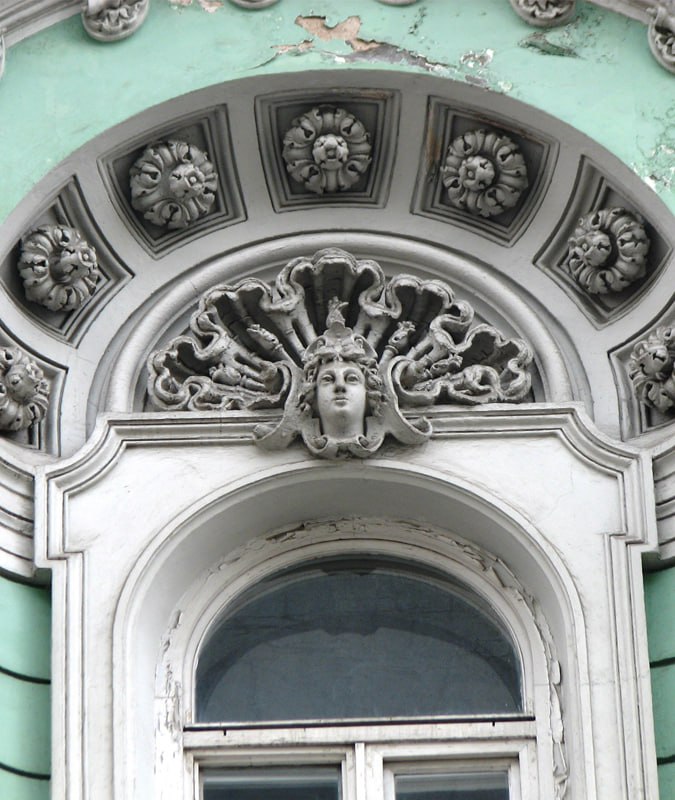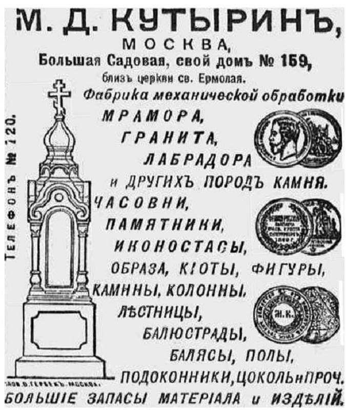 Знаете ли вы, что на доме № 8 по Ильинке сохранилась уникальная рекламная визитка, сообщающая, что декор изготовлен в мастерской Михаила Дмитриевича Кутырина – одной из самых известных скульптурно-декоративных контор в Москве? Фасад здания Московского купеческого общества насыщен декором – атлантами, колоннами, капителями, львиными масками и другой лепниной. Роскошный и тяжеловесный декор заимствован из мотивов французского барокко. Камнерезы мастерской Кутырина постарались на славу. У Михаила Дмитриевича было немало заказов. Например, в его мастерской была изготовлена великолепная лестница-волна, украшающая особняк Рябушинского на Спиридоновке.