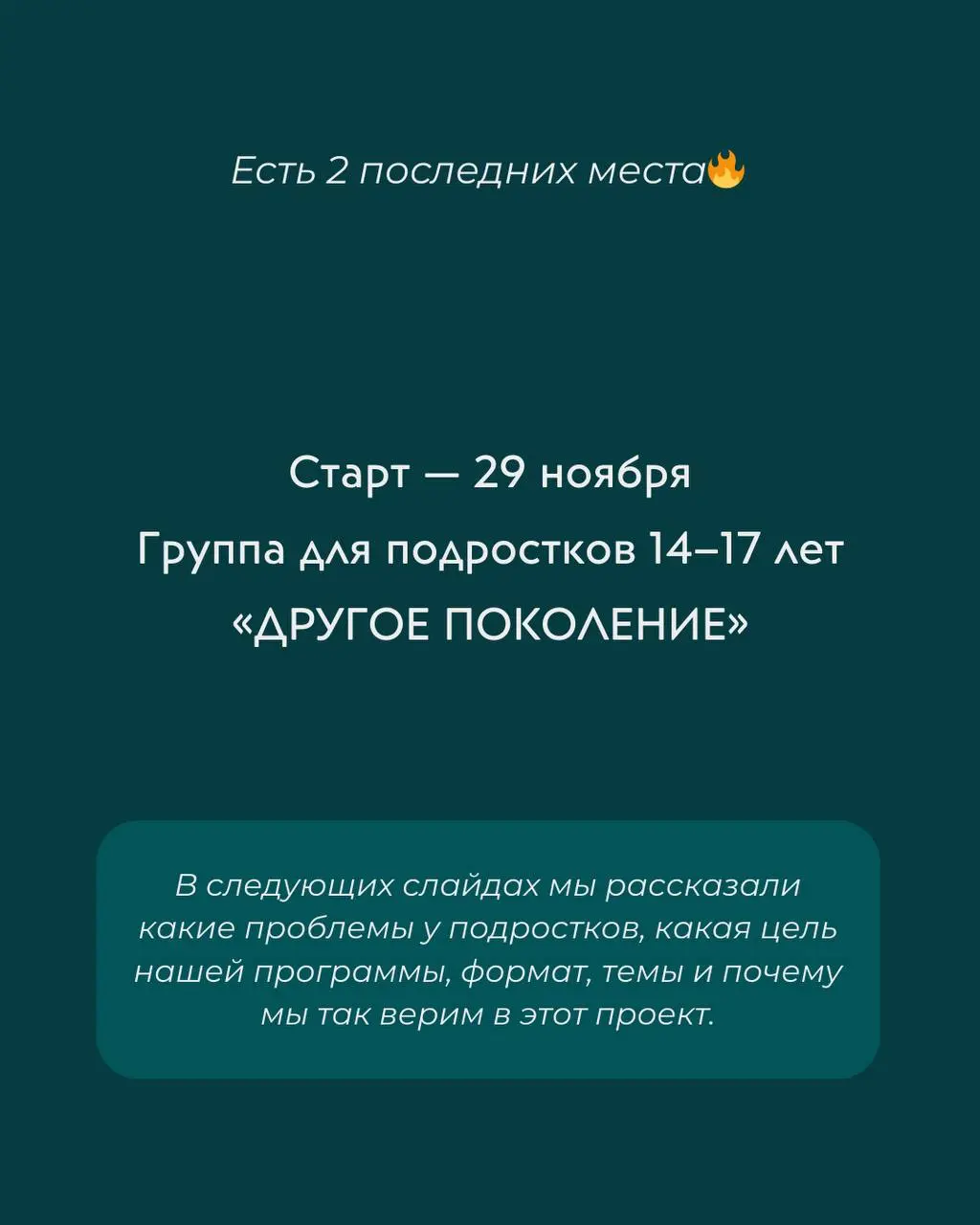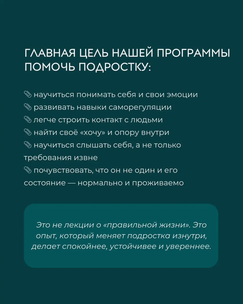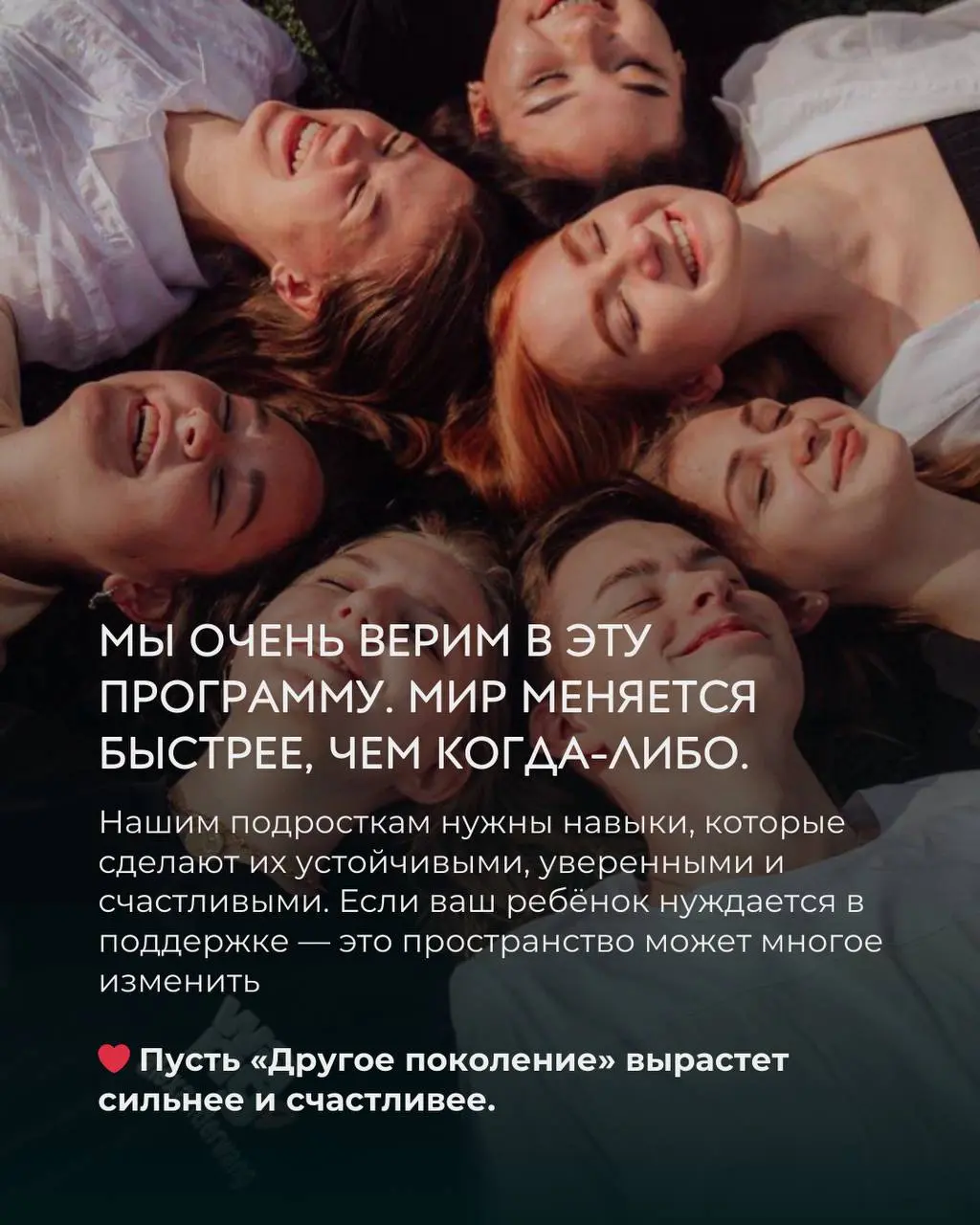 Подростковый возраст часто сопровождается давлением со стороны школы, взрослых и соцсетей. Мы создали пространство, где подростки могут быть собой и говорить честно. Программа направлена на развитие устойчивости, уверенности и счастья у подростков. Места ограничены: осталось 2 позиции. Офис находится по адресу: Москва, 1-й Нагатинский пр., д. 11, корп. 3. Текст под фото подчеркивает, что детям нужны навыки, помогающие стать stronger и счастливее.