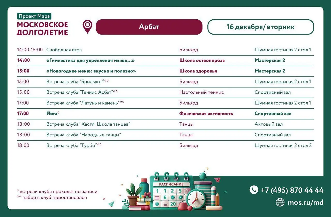 В программе мероприятия на 16 декабря 2025 года: гимнастика для укрепления мышц, школа остеопороза, встреча клубов «Бриллиант», «Теннис Арбат», «Латунь и камень», йога, хастл, народные танцы и встречи клуба «Турбо». Приходите в Центр Московского долголетия! 💃