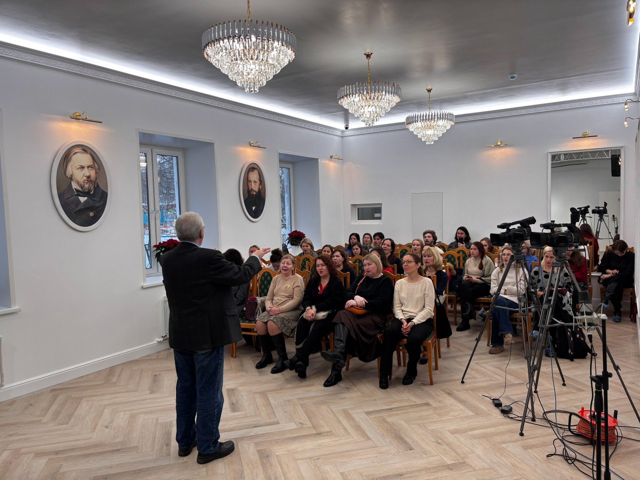 17 декабря в Белом зале прошёл мастер-класс Виктора Вадимовича Емельянова, кандидата педагогических наук, автора фонопедического метода развития голоса. Мастер-класс был организован Центром профессионального мастерства по направлению «Музыкальный фольклор» при поддержке ДШИ имени М.А.Балакирева.