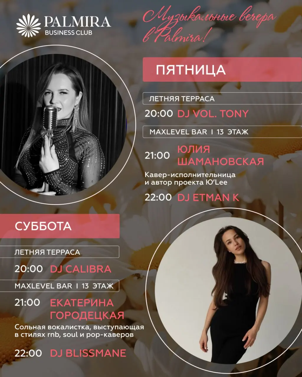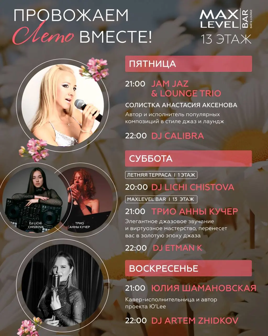 Летние ночи наполняются звуком — живой вокал, яркие DJ-сеты и атмосфера, в которую хочется возвращаться! 8 августа — DJ ShevaShura, 21:00 — Nastya Fox — кавер-исполнительница, 22:00 — DJ Artem Zhidkov. 9 августа — DJ Anastasea, 21:00 — Юлия Шамановская — кавер-исполнительница и автор проекта Ю'Lee, 22:00 — DJ ShevaShura. Мероприятие проходит на летней террасе и в MaxLevel Bar.