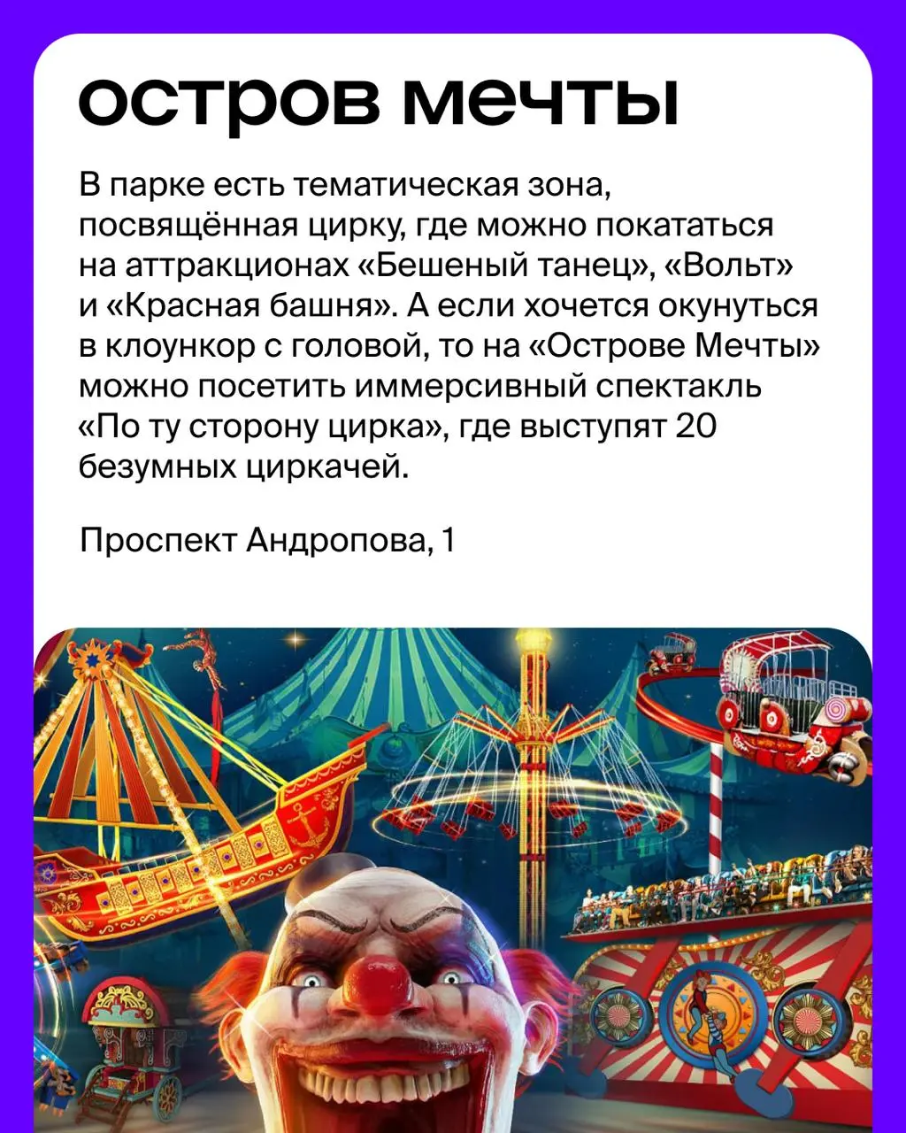 Circuscore и clowncore в Москве! Готовы окунуться в мир гротеска и театральности? Найдите места, где можно увидеть клоунский спектакль-феерию. 🤡 Можно сделать тематические фото и прокатиться на аттракционах в цирковой стилистике. !