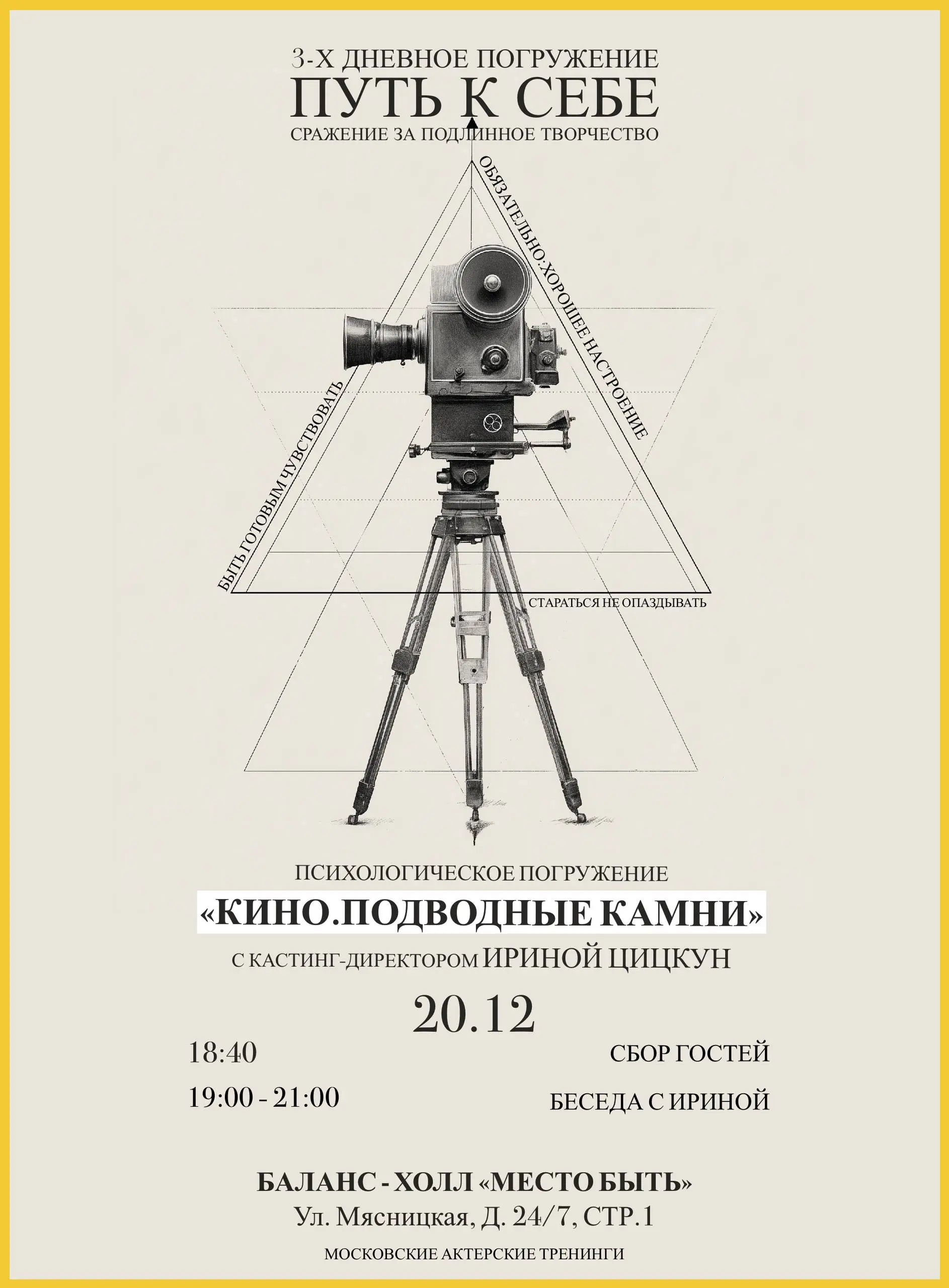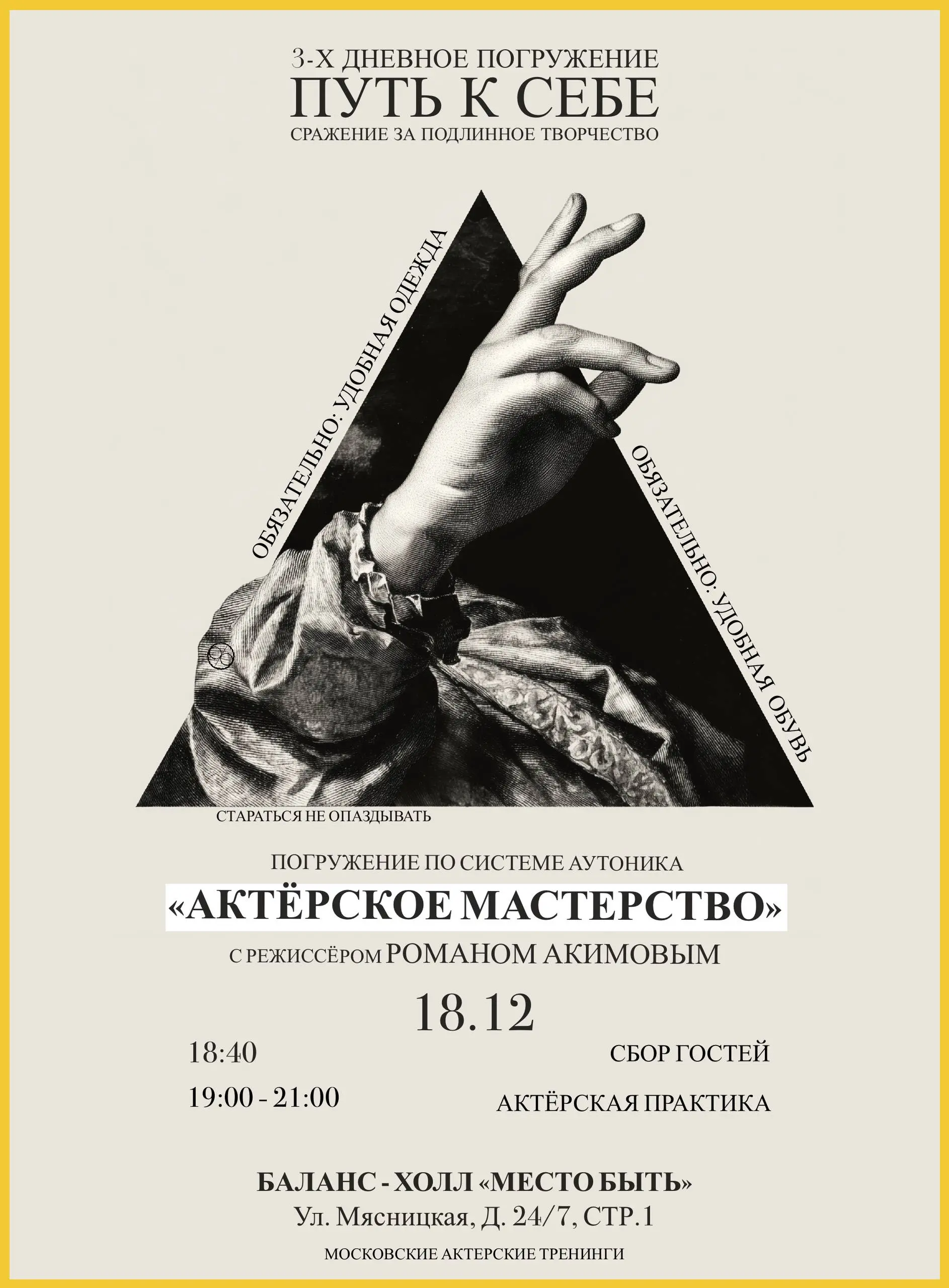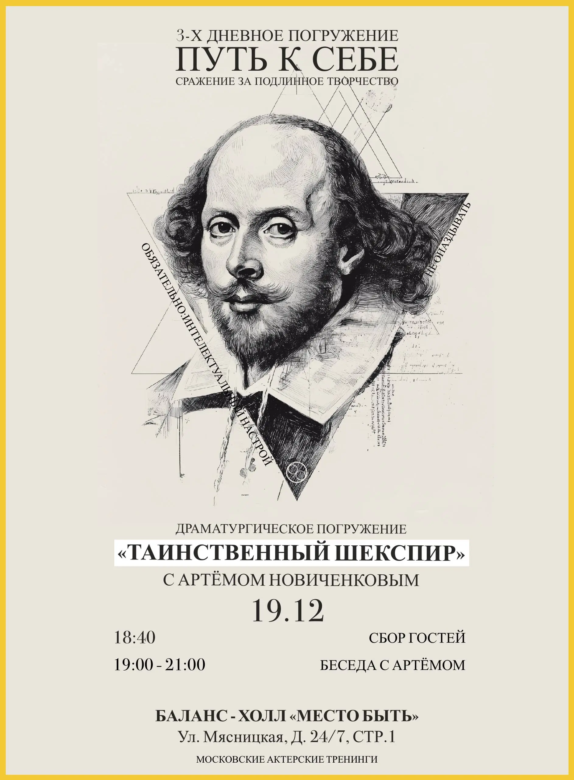 Приглашаем на трехдневное творческое погружение. Мероприятие посвящено свободе творчества и поиску себя. 18 декабря Роман Акимов расскажет об актерском мастерстве по системе Аутоника. 19 декабря Артём Новиченков проведет лекцию о Шекспире. 20 декабря Ирина Цицкун проведет психологическое погружение в кино. Три вечера — три акта внутренней пьесы. Это пространство вдохновения и обновления 💫. Регистрация обязательна.