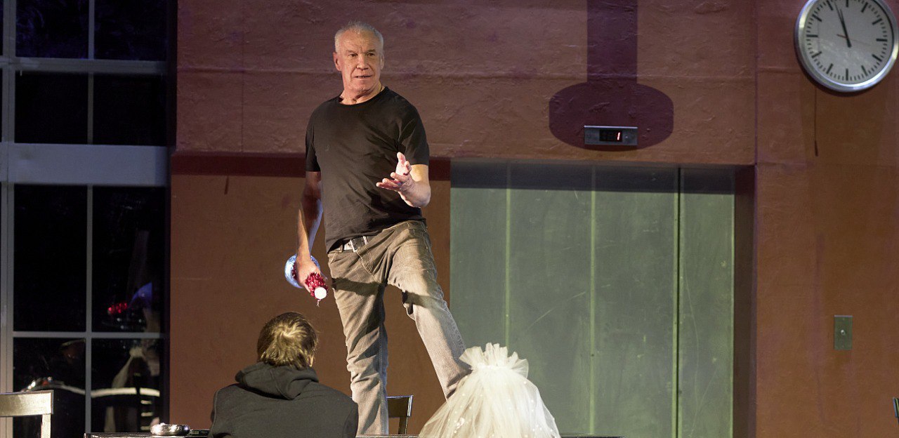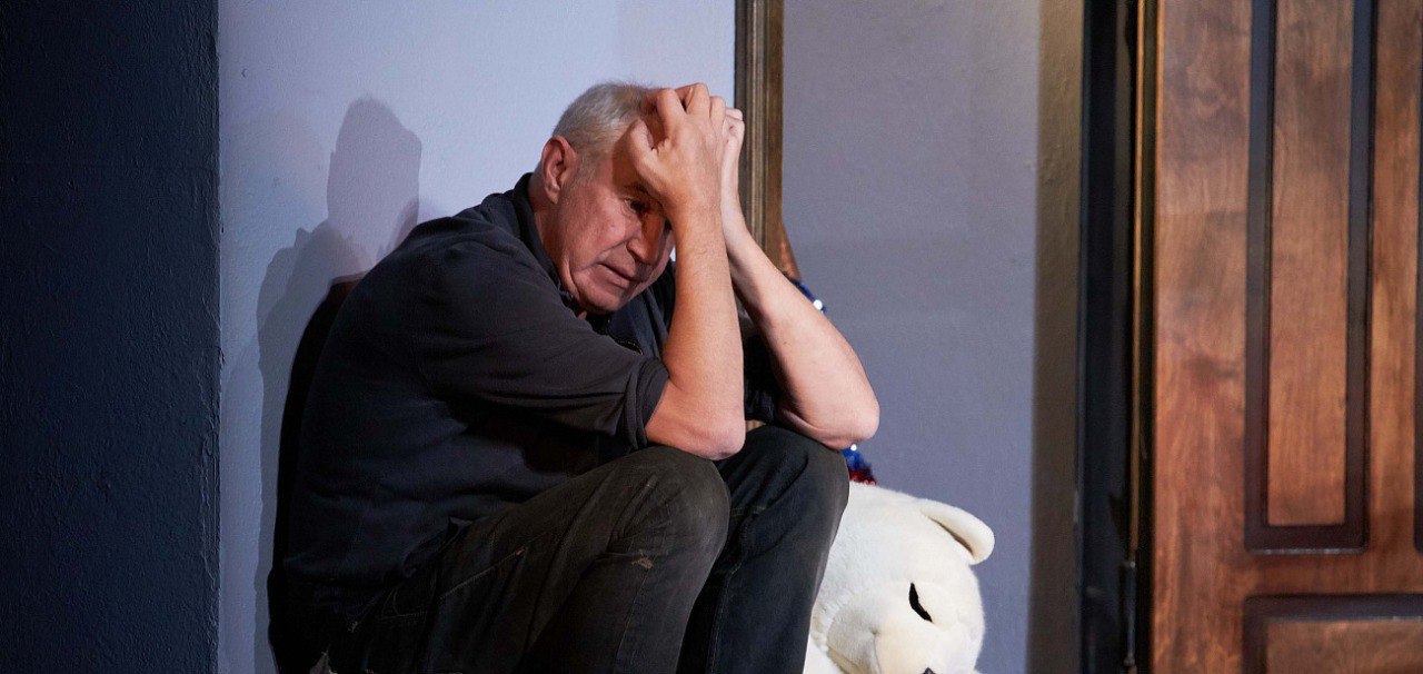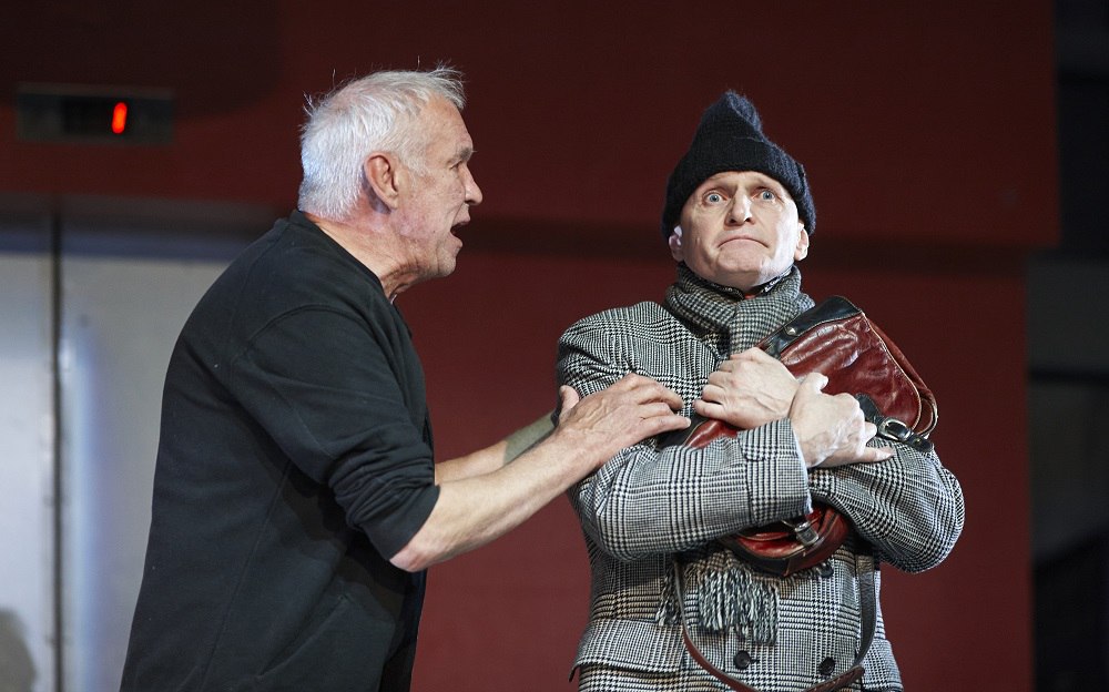 Сергей Гармаш и Владимир Большов на сцене в «новогодней», но абсолютно внесезонной истории случайной встречи двух однокурсников на лестничной площадке, в последний час уходящего года.