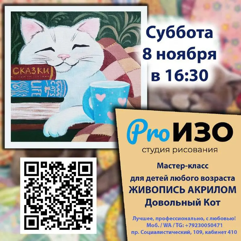 Курс подходит для начинающих и продвинутых художников и посвящен интерьерной акриловой живописи: освоение методов создания интерьерной картины, акриловые фактуры, графичный образ, нанесение акрила на холст, работа с золотой/серебряной поталью, текстурная паста, композиция и передача объема, техника Флюид Арт. Занятия проходят раз в неделю по 120 минут, продолжительность курса 3 месяца. Все материалы и инструменты предоставляются, обучение в малых группах. Расписание: пятница с 18:30 до 20:30. Стоимость: 4800 руб./мес. (4 занятия) или 12 960 руб. за три месяца. Организатор: Художественная студия «ProИЗО». Контакты для записи: телефон +79230050471. Адрес: пр. Социалистический, 109, кабинет 410.
