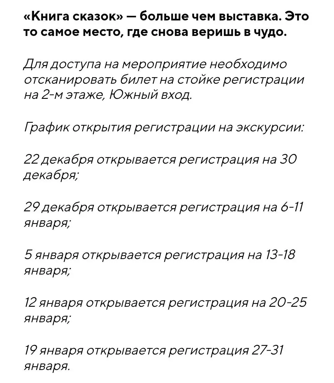 Выставка «Книга сказок» ждет гостей с 16 декабря по 31 января 2026 года. Она наполнена интерактивными элементами и создана, чтобы подарить веру в чудо. Для посещения необходимо отсканировать билет на стойке регистрации на втором этаже. Открытие регистрации на экскурсии запланировано на разные даты. 22 декабря откроется регистрация на 30 декабря. 29 декабря откроется регистрация на период с 6 по 11 января. 5 января откроется регистрация на 13-18 января. 12 января откроется регистрация на 20-25 января. 19 января откроется регистрация на 27-31 января.✨