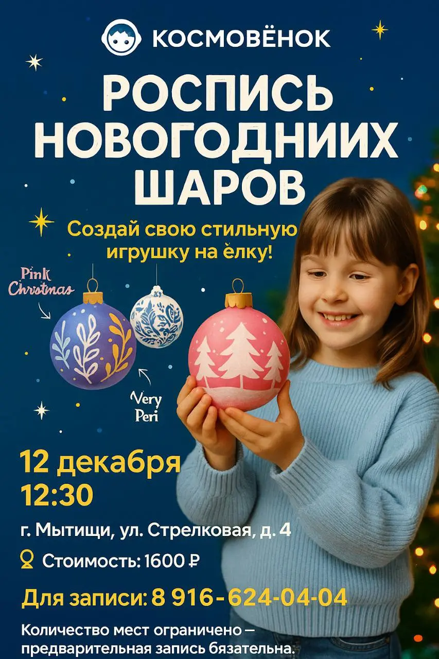 Приглашаем на новогодние праздники в Космовенок! Для детей есть иммерсивная ёлка «Секретное Агентство Мороза». Возраст: от 5 до 12 лет. Дата: 27 декабря. Время: 12:00. Стоимость билета — 2300 ₽ до 10 декабря. А еще можно посетить мастер-классы: Роспись новогодних шаров. Когда: 13 декабря. Время: 12:30. Стоимость: 1600 ₽. Ёлочка, сияющая мечтами. Когда: 13 декабря (СБ). Время: 16:30. Стоимость: 1500 ₽.🎉 Место проведения: г. Мытищи, ул. Стрелковая, 4.