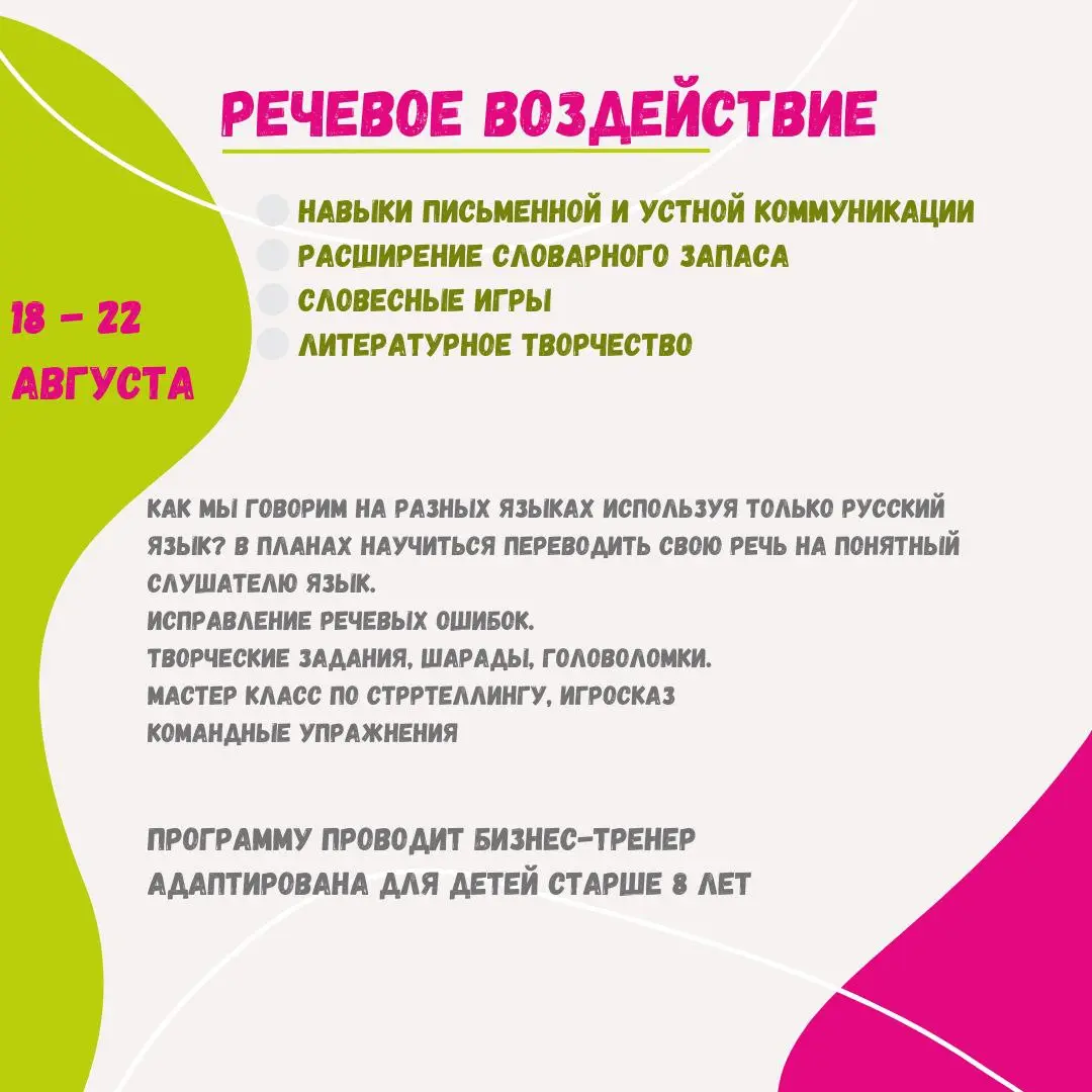 Проект 🟢ЛЕТО ДЕТЯМ🟢 открыл сезон, а дети уже записываются на повторные смены. В период с 16 июня по 21 августа запланированы различные тематические смены: Биология с Гульнарой Маратовной, Творческое погружение с Татьяной Дёминой, Режиссерская смена с изучением цвета и маркетинга, спортивные и языковые программы, археология и повторные мероприятия по Гарри Поттеру, а также открытие речевого воздействия с Юлией Александровной Фураковой. В программе мероприятия экскурсии, авторские программы, профессиональные педагоги, подвижные игры на свежем воздухе, наставничество, безопасность, питание. В дополнение — мастер-классы по археологии, спокойство и осознание историко-культурной ценности, экскурсии в краеведческий музей. Контактный номер: 89636241821.