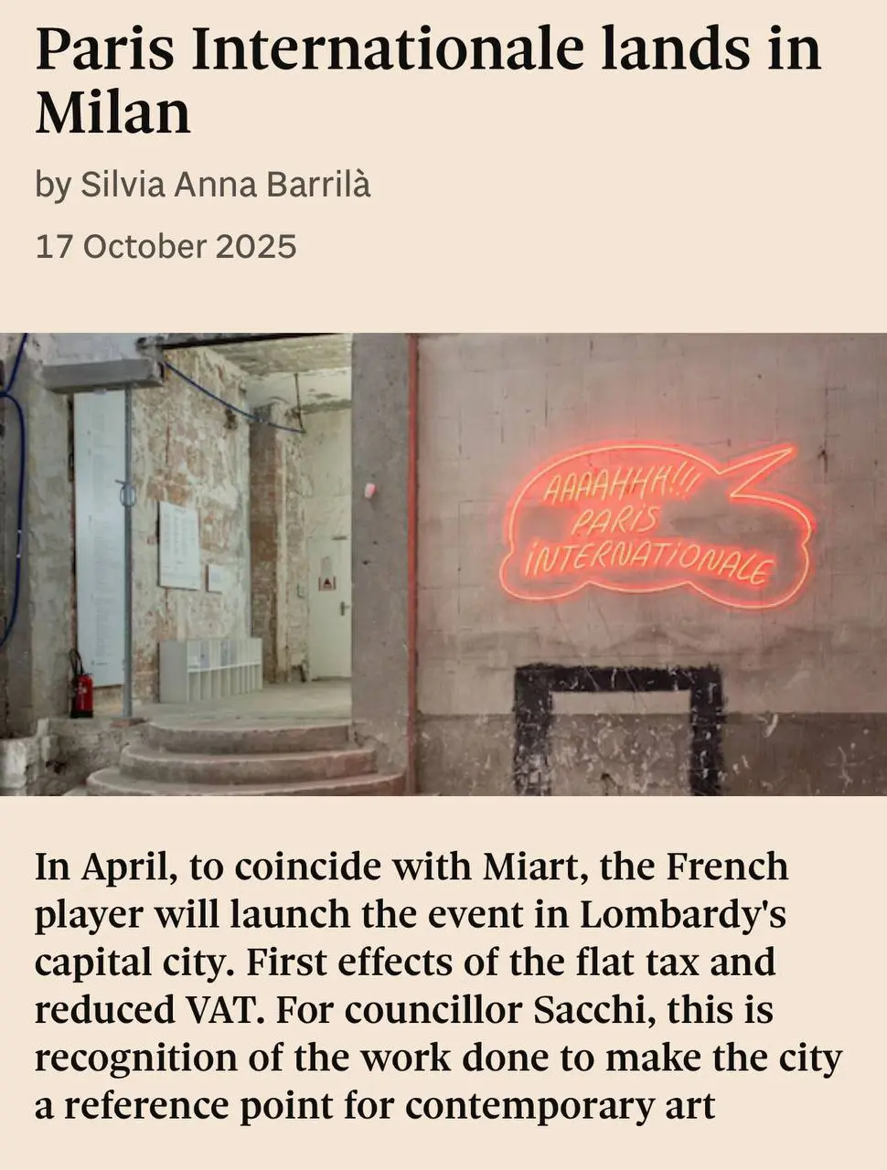 Выставка-диалог между двумя художниками: Даниэль Бюрен — концептуалист, известен интервенциями в общественные пространства; Майлз Гринберг — представитель молодой волны перформанс-искусства. Открытие в парижском Reiffers Art Center 24 октября. Текст с прикреплёнными фотографиями содержит упоминания о Numero art и других художниках/фондов. Выставка идёт до середины декабря.
