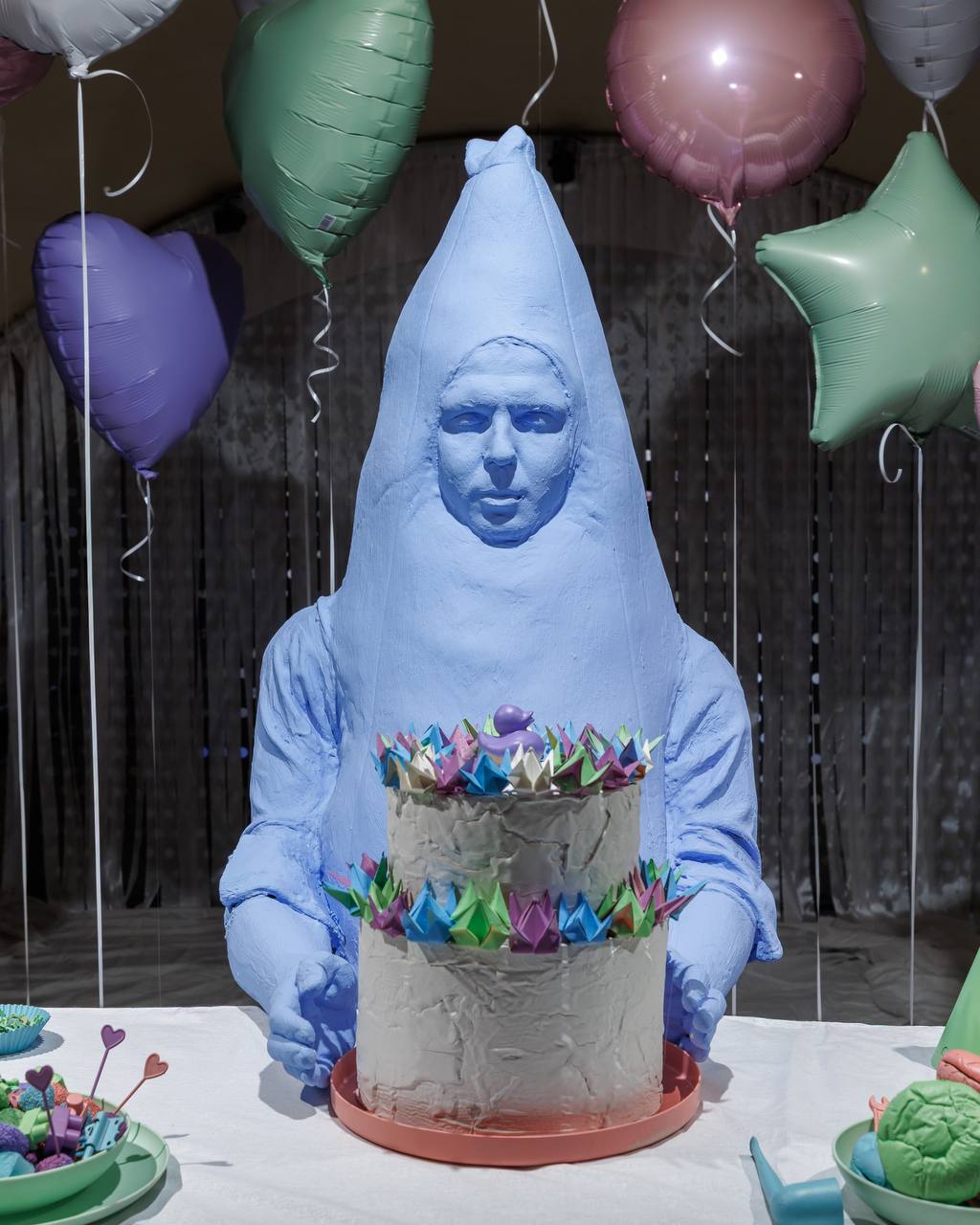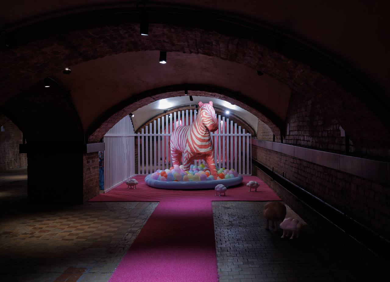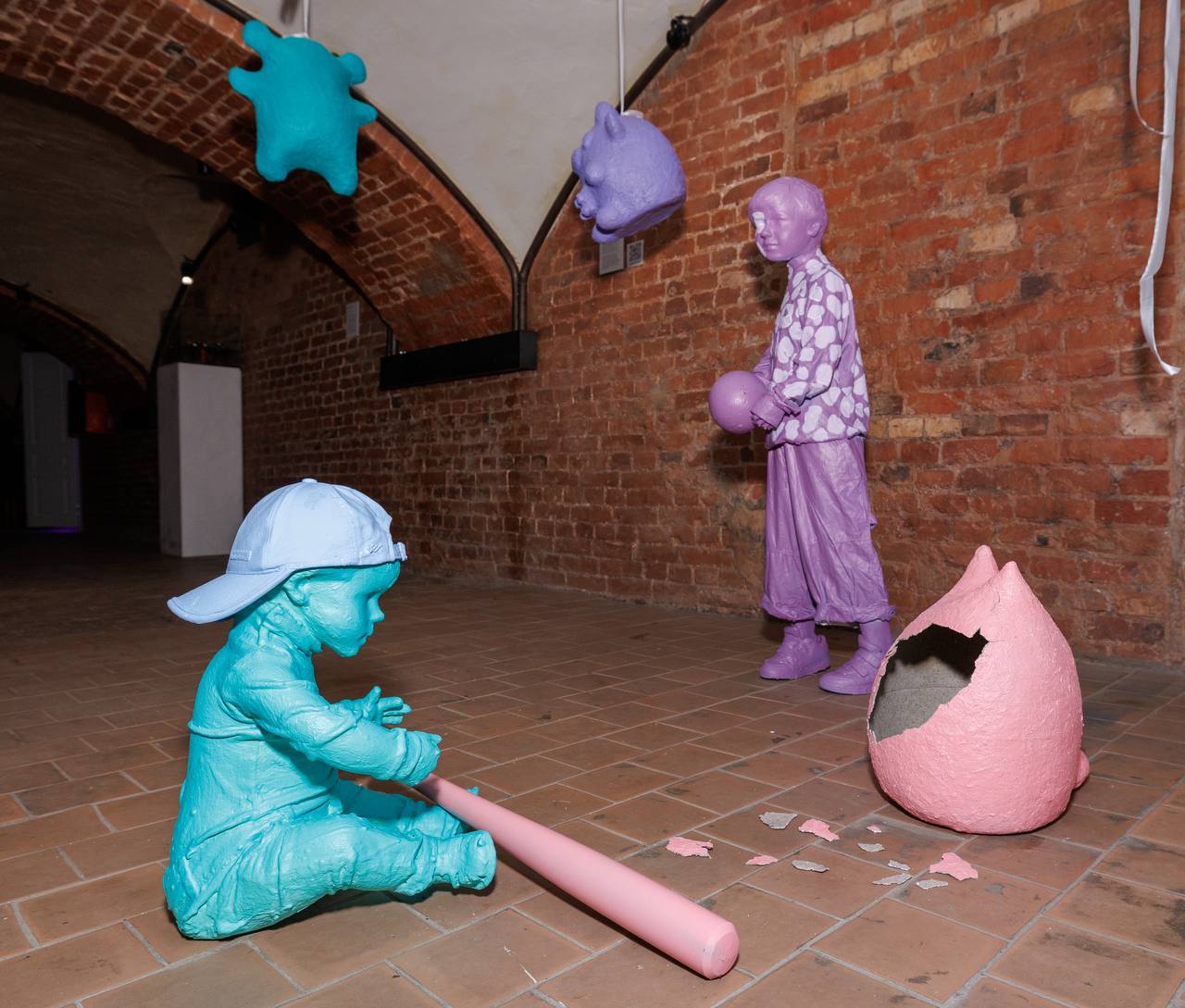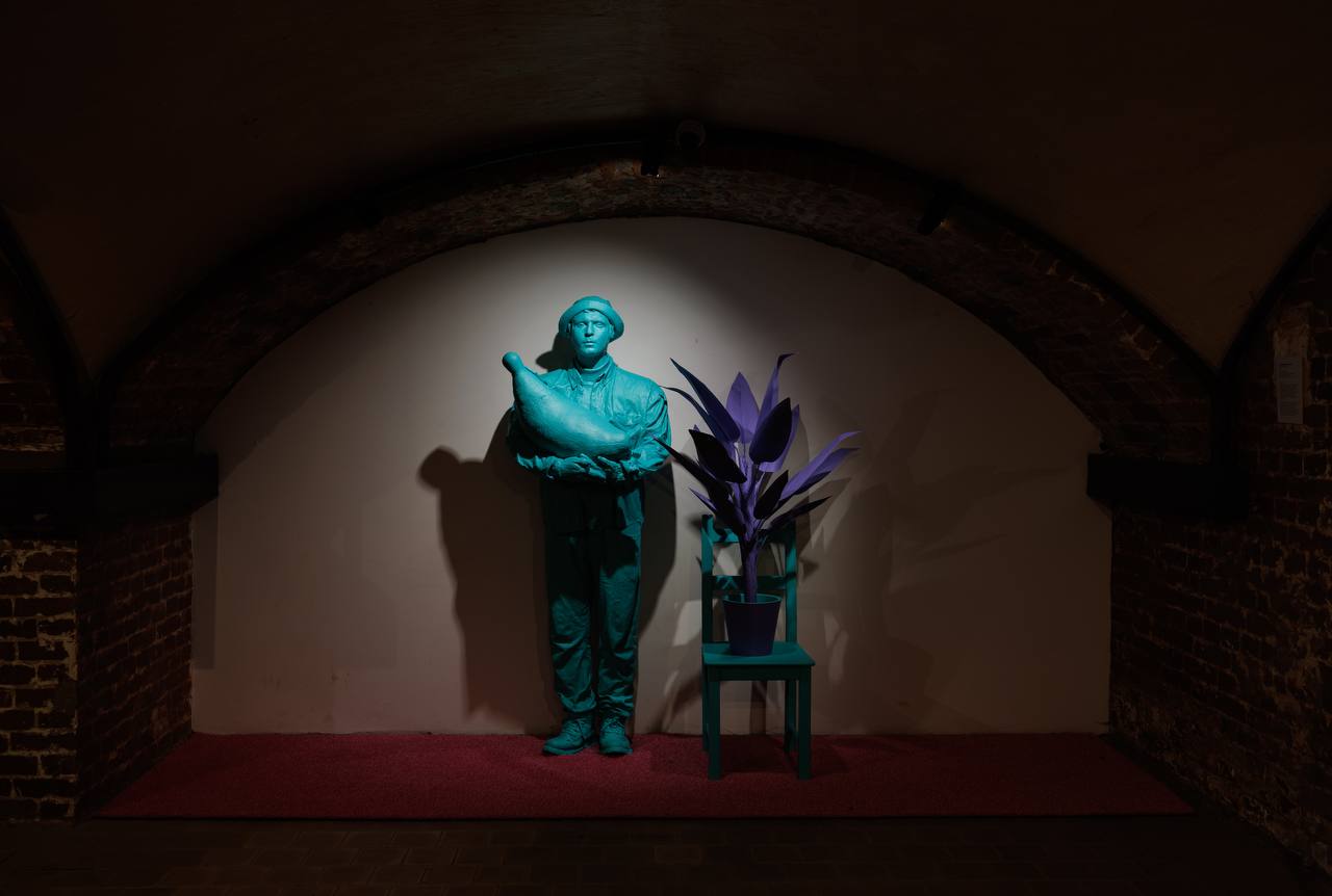 Пространство выставки наполнено скульптурными автопортретами художника в разных временных состояниях — как будто он ведёт хронику самого себя, но без желания дойти до финала. Зрителя встречают образы из личной мифологии автора: человек в костюме банана, толпа детей, наблюдающих за зеброй, семейный портрет с пальмой. Это не просто сюжеты — это фрагменты внутреннего мира, собранные в некий абсурдный, но трогательный праздник.