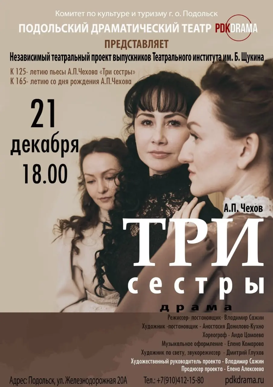 Подольский драматический театр представляет спектакль «Три сестры». Это постановка по пьесе Антона Павловича Чехова. Спектакль приурочен к двум датам: 125-летию пьесы и 165-летию со дня рождения автора. Вы увидите пронзительную интерпретацию чеховской пьесы. Почувствуйте тоску по несбыточному и надежду на лучшее. Ждём вас! 🎭