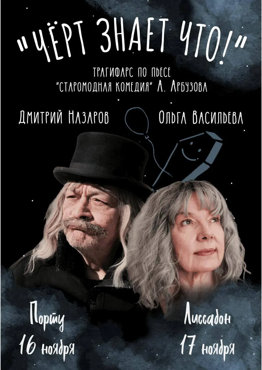 Спектакль «Чёрт знает что!» переносится в гастрольный тур: в ноябре в Порту и Лиссабоне пройдут гастроли по пьесе Алексея Арбузова «Старомодная комедия». В постановке задействованы Дмитрий Назаров и Ольга Васильева. Даты: 16 ноября — Порту, 17 ноября — Лиссабон. Билеты и подробности — по ссылке.