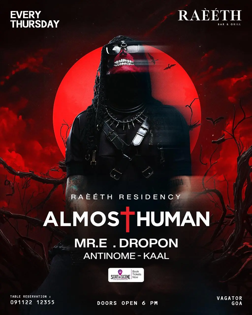 Текст описывает мероприятие: место CODE RED CLUB, лайн-ап музыкантов MONKEY SPACE, SASHA EYE, KOSTYA SWAMI, INOY, жанр Techno, время начала 21:00, цена указана как starts at 475 ₹, бесплатный вход и бесплатная сангрия для девушек. Упоминаются теги и контакты для бронирования.