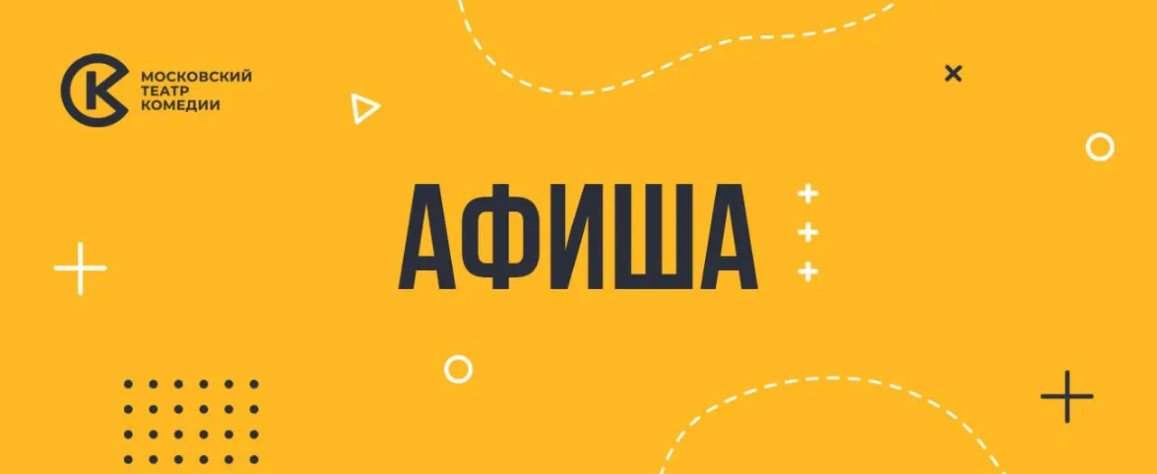 Публикуются даты и названия спектаклей, запланированных на ближайшее время в Москве и Санкт-Петербурге. Упомянуты способы просмотра полной афиши на сайте и скидка 20% по промокоду ПОСМОТРИМ. Текст сопровождается пометками о московском TEATРЕ КОМЕДИИ и афише.