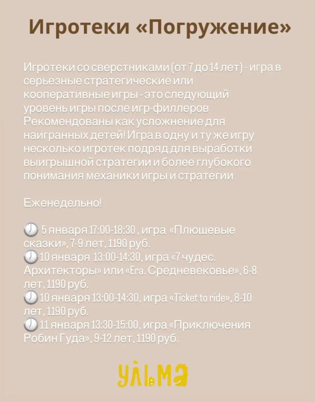 Приглашаем детей и родителей на серию игротек! Будем играть и общаться, создавая яркие воспоминания. Для детей от 7 до 14 лет. Ждем всех, кто хочет окунуться в мир настольных игр и общения. Подробности каждого мероприятия будут в отдельных постах. Успейте забронировать место. Новогодние каникулы и хорошие эмоции гарантированы! ❄🎄