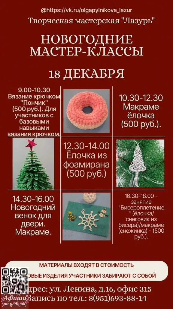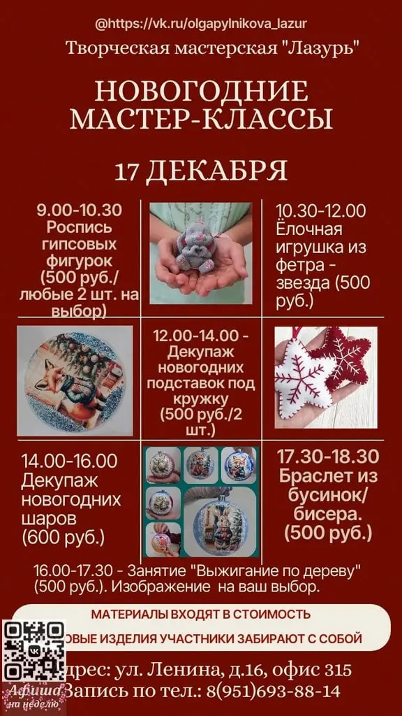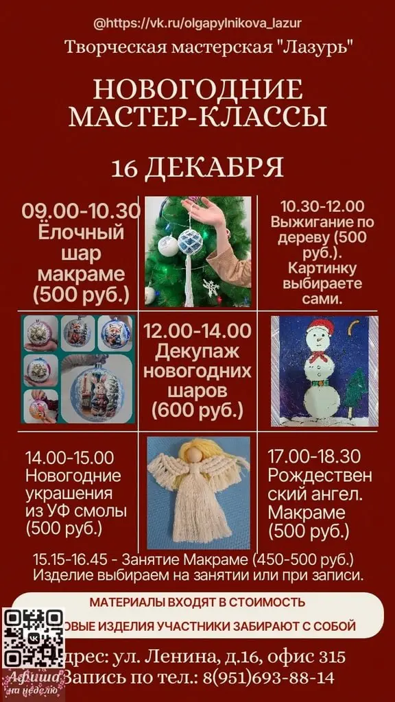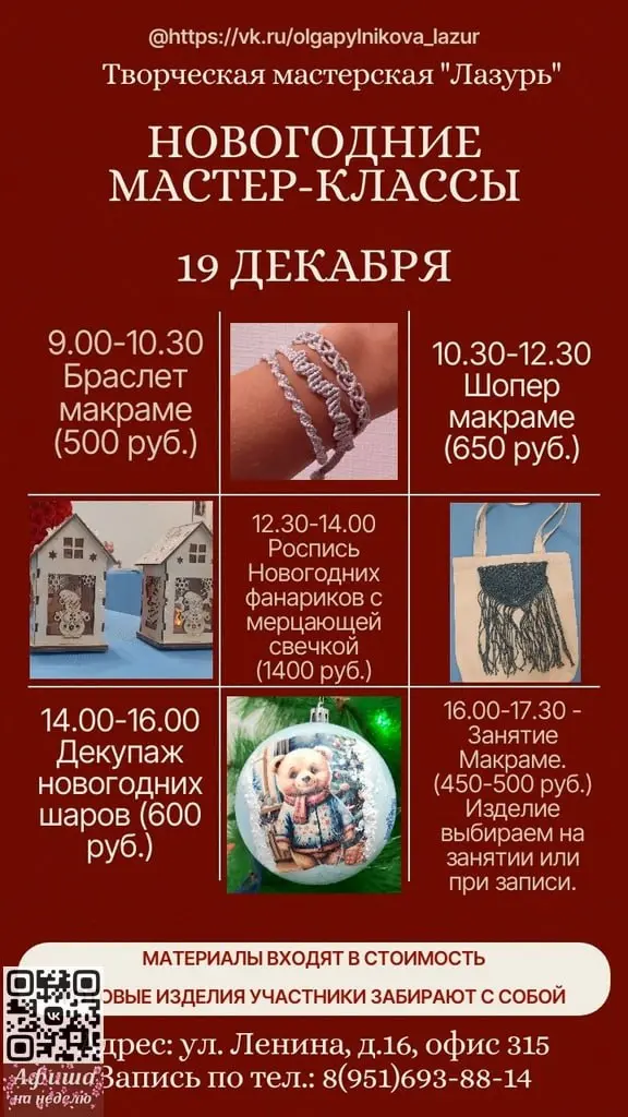 Творческая мастерская "Лазурь" приглашает на новогодние мастер-классы. Вас ждут интересные занятия. Можно сделать браслеты, шоперы в технике макраме. Также можно расписать новогодние фонарики. Будет декупаж новогодних шаров. Все изделия участники забирают с собой. Запись по телефону и адресу.